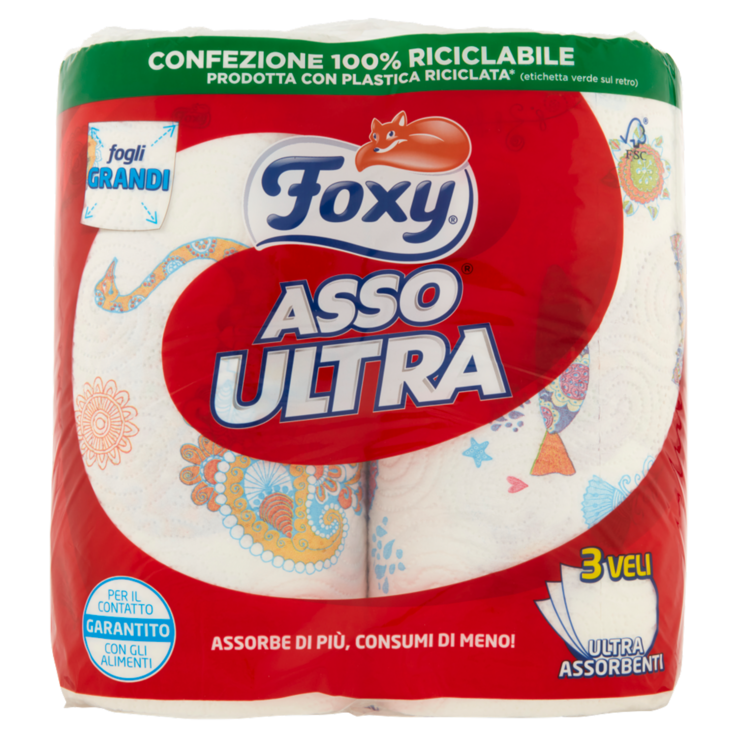 Assorbe di più, consumi di meno! - Fogli 3 Veli: più assorbenti e più resistenti, per prestazioni ultra. - Goffratura Vortici Superassorbenti: assorbono e trattengono l'acqua al loro interno, per una maggiore assorbenza. - Fogli Grandi: se ne può usare uno alla volta, ottimizzandone l'uso ed il consumo. - Maxi Rotolo: tanta carta di alta qualità. - Garantito per il Contatto con gli Alimenti: l'idoneità degli asciugatutto Foxy al contatto con gli alimenti è garantita da rigorosi test condotti presso laboratori qualificati. - Microonde Compatibile: può essere utilizzato nel microonde per scaldare o per scongelare gli alimenti*. - Igienico: asciugare le mani con carta permette di rimuovere più efficacemente eventuali batteri residui evitando di passarli all'utilizzatore successivo, come nel caso di asciugamani tradizionali. - Decorato: decori d'arredo realizzati utilizzando colori a base acqua, per un asciugatutto idoneo al contatto con gli alimenti. *Leggere attentamente le istruzioni poste sul lato della confezione.