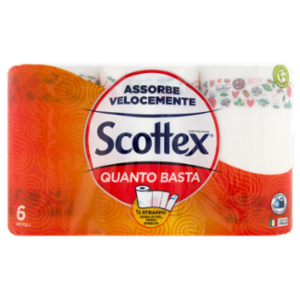 Quanto Basta Scottex vuole essere al tuo fianco ogni giorno per aiutarti a raggiungere il massimo del risultato, con il minimo sforzo. Scottex Quanto Basta, grazie alla funzione 1/2 strappo, è studiato per darti sempre un foglio della misura giusta, perché scegli tu quanto usarne in base ai tuoi reali bisogni. Metà, un foglio intero, o quanto ne vuoi... Con l'opzione mezzo strappo puoi ridurre gli sprechi e risparmiare rispetto ai rotoli tradizionali. Con Scottex Quanto Basta nessun foglio sarà troppo piccolo o troppo grande per le tue esigenze! Scottex Quanto Basta Sempre la giusta quantità di carta Scegli un consumo responsabile