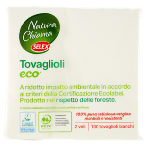 I Tovaglioli Natura Chiama Selex Eco con goffratura ai bordi in pura cellulosa vergine, morbidi e resistenti.
