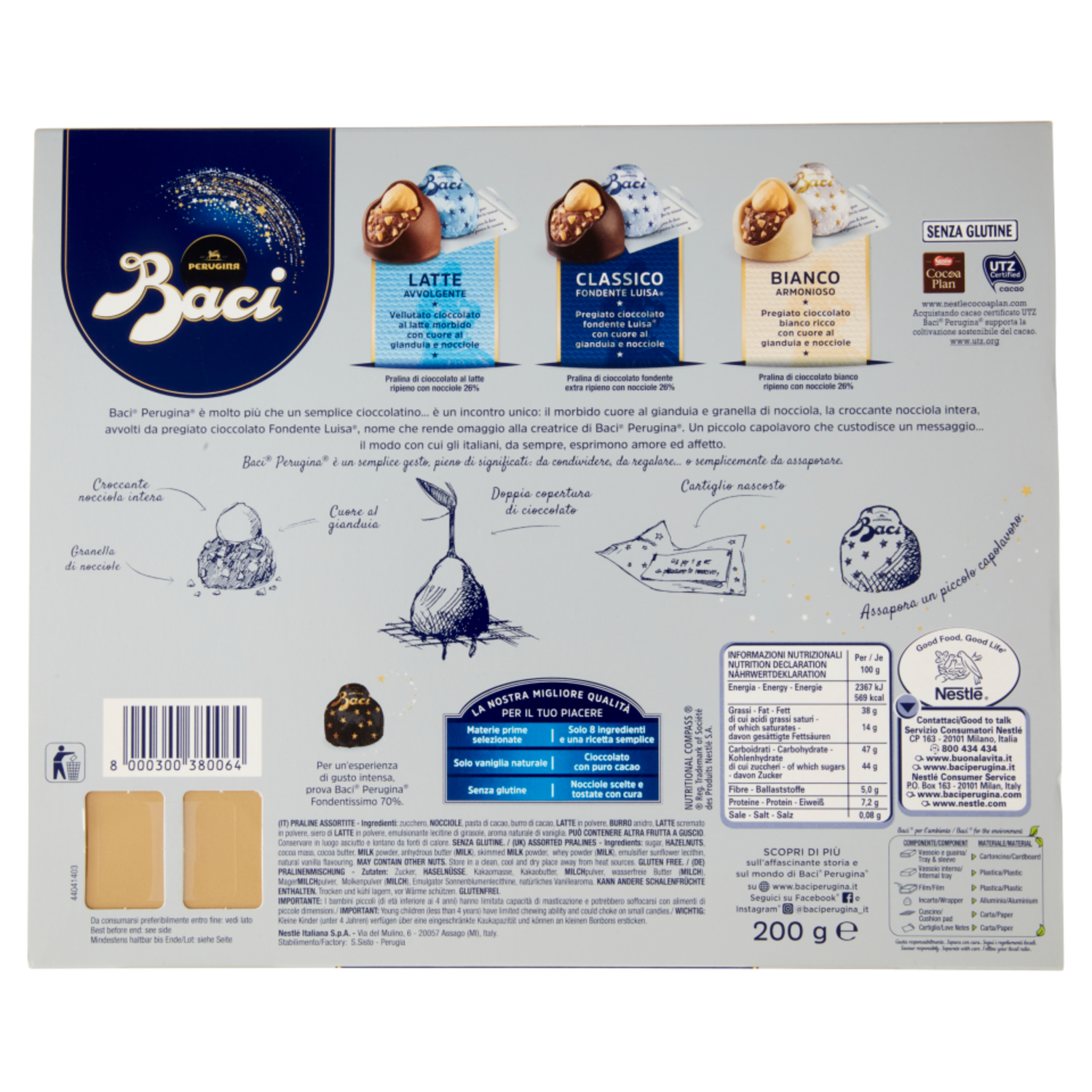 BACI PERUGINA Assortito è una raffinata selezione di cioccolatini: l'inconfondibile cuore al gianduia e la nocciola intera sono avvolti da pregiato cioccolato Fondente Luisa, cremoso cioccolato al latte e ricco cioccolato bianco, per una triplice esperienza di piacere. Un piccolo capolavoro che custodisce un messaggio…il modo con cui gli italiani, da sempre, esprimono amore ed affetto. La scatola Natale BACI PERUGINA Assortito è il regalo perfetto per stupire e celebrare le feste con un simbolo di alta qualità e pieno di significati. - Raffinata selezione di cioccolatini con cuore al gianduia e nocciole - Ideale da regalare per sorprendere, esprimere un gesto di gratitudine e celebrare occasioni speciali - Cioccolato con puro cacao e nocciole scelte e tostate con cura - Materie prime selezionate - Solo vaniglia naturale - Senza glutine - Scatola festiva con vassoio dorato e dettagli lucenti Prova anche BACI PERUGINA nel gusto Fondentissimo 70%. Scopri tutti i prodotti BACI PERUGINA su www.baciperugina.it BACI PERUGINA aderisce al progetto NESTLÉ Cocoa Plan in collaborazione con UTZ per migliorare la vita dei coltivatori e la qualità dei loro prodotti. Scopri di più su www.nestlecocoaplan.com