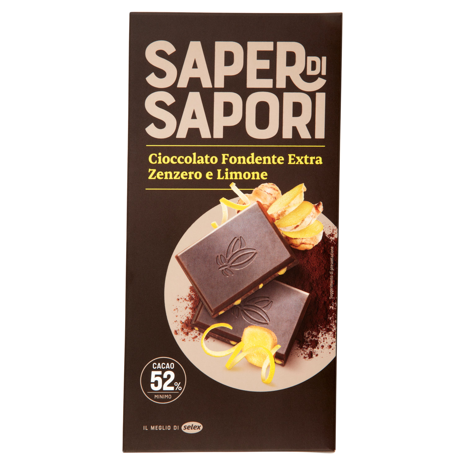 Cioccolato fondente extra con zenzero candito e olio di limone. (Cacao: 52% minimo)