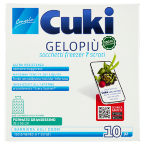 Caratteristiche Scopri i vantaggi dei Sacchetti Cuki Gelopiù! Il risultato della conservazione degli alimenti dipende anche dalla qualità del sacchetto utilizzato. Per questo motivo Cuki ha realizzato i Sacchetti Cuki Gelopiù con l'esclusiva formula in polietilene a 7 strati differenziati per offrirti: * Effetto barriera: isolamento dagli odori, protezione dal gelo. * Ultra elasticità e resistenza alle lacerazioni e perforazioni. * Extra tenuta: saldatura multipla rinforzata sul fondo. * Trasparenza e brillantezza: per riconoscere con facilità il contenuto. Per garantirti i più elevati standard di sicurezza alimentare i Sacchetti Cuki Gelopiù sono realizzati attraverso l'esclusivo processo di sterilizzazione dell'aria "Stery System". I sacchetti vengono igienizzati internamente attraverso l'utilizzo di aria filtrata e sottoposta a raggi UVC in camera di sterilizzazione. Polietilene trasparente a 7 strati differenziati - per un totale isolamento dagli odori - per una maggiore resistenza Soffietti laterali - per evitare la formazione di sacche d'aria - per migliorare la stabilità del sacchetto Etichetta prestampata - per indicare contenuto e data di conservazione Fondo con saldatura multipla rinforzata - per una migliore tenuta 10 Laccetti metallici - per richiudere con facilità i sacchetti
