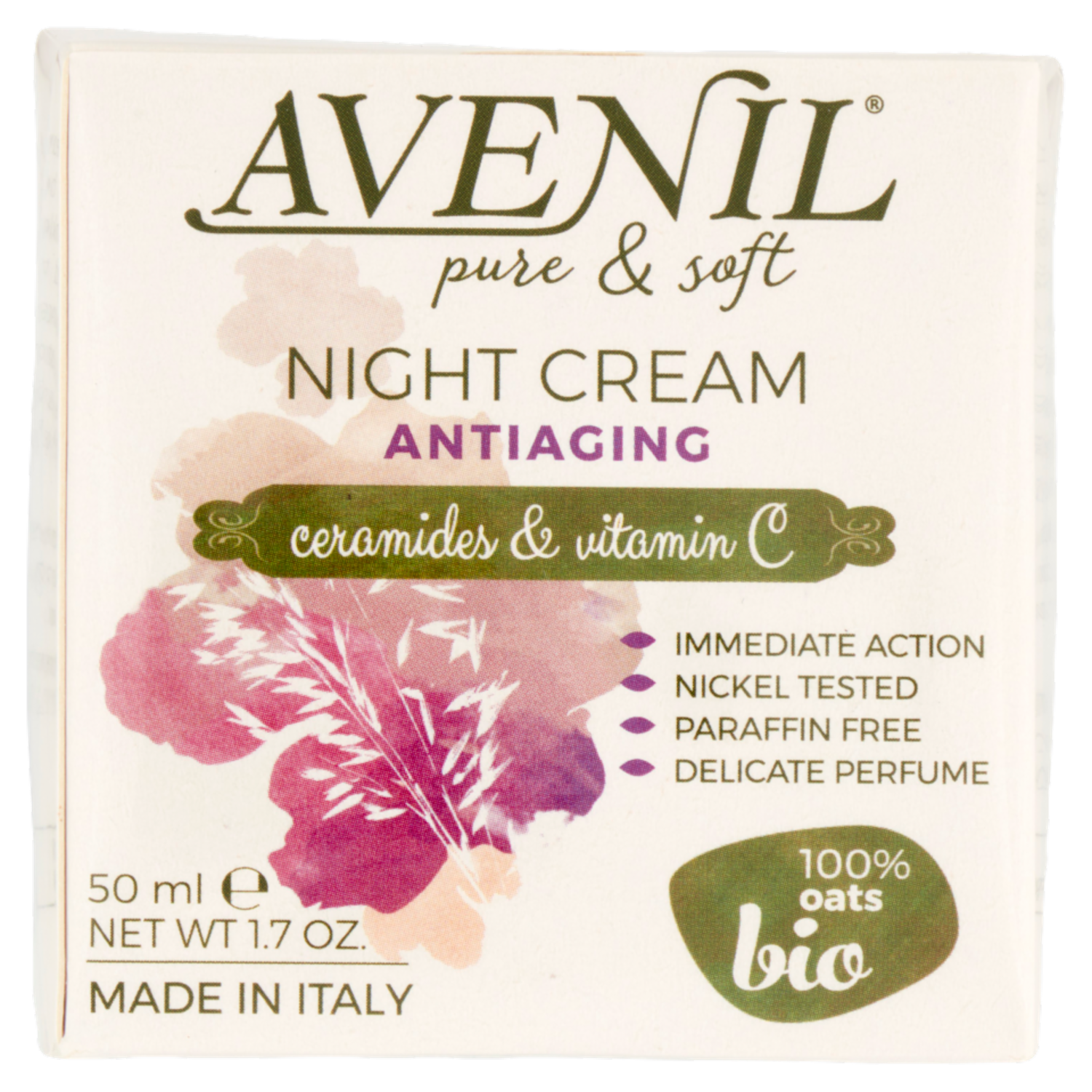La Crema Antietà specifica per la Notte Avenil Pure & Soft con Ceramidi, Vitamina C e Avena* è stata formulata per contrastare l'insorgenza di piccole rughe. L'attenta ed innovativa formulazione agisce durante il riposo notturno per ristabilire il naturale equilibrio della pelle più stressata ed atona, restituendole morbidezza e tonicità. Per aumentarne l'efficacia se ne consiglia l'uso quotidiano in abbinamento con la crema Giorno Antietà Avenil. * Formula con avena proveniente da agricoltura biologica Dermatologicamente testato.