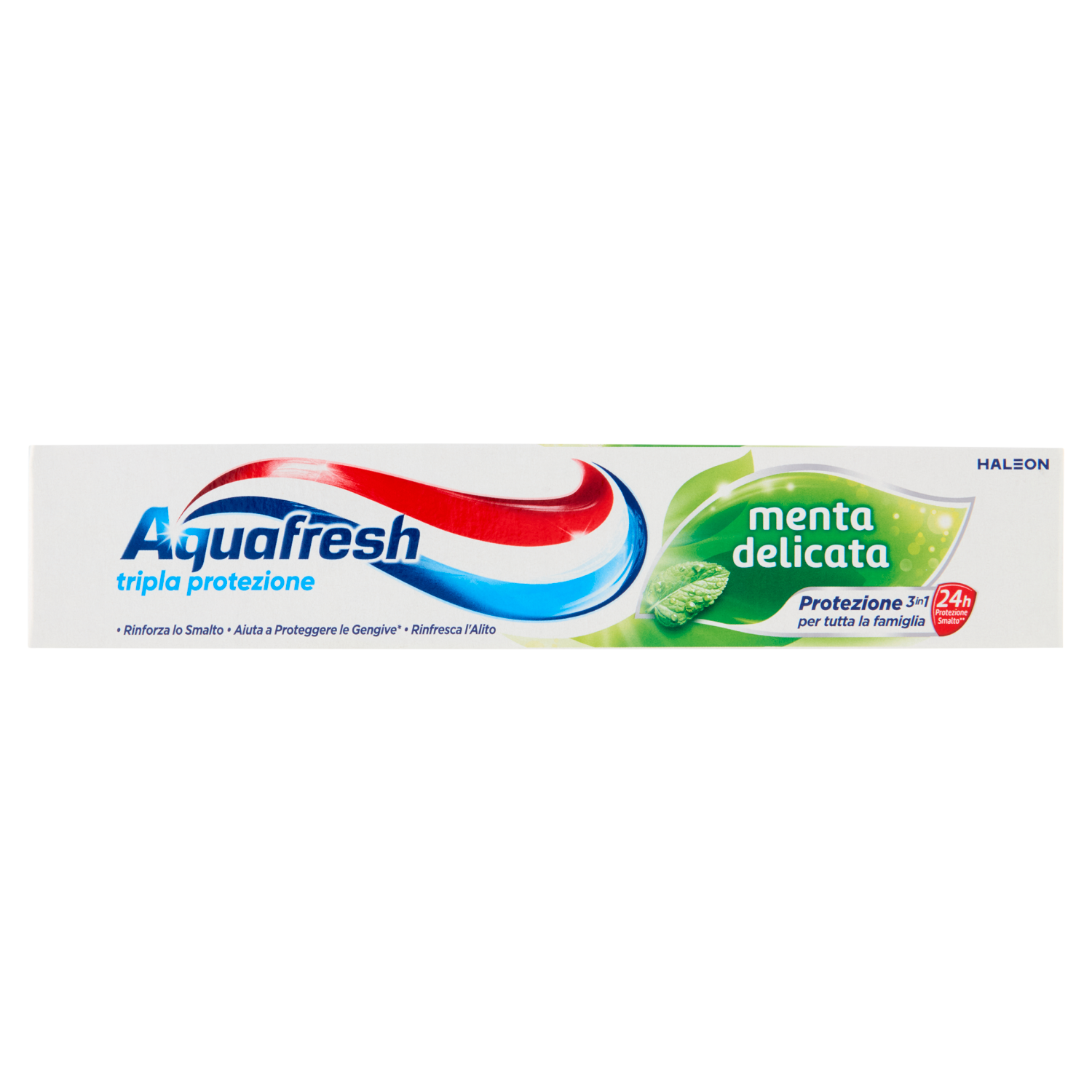 Il dentifricio Aquafresh Tripla Protezione Menta Delicata è un dentifricio 3-in-1 dal gusto delicato per la famiglia, con 24 ore di Sugar Acid Protection fornita dal fluoro* che aiuta a proteggere dagli acidi degli zuccheri presenti nella placca, la principale causa della carie. Quando ti lavi i denti, a livello microscopico i minerali attivi vengono assorbiti dai tuoi denti, rinforzandoli. Ciò crea uno scudo protettivo che aiuta a bloccare l'attacco degli acidi derivati dagli zuccheri per tutto il giorno*. *spazzolando i denti due volte al giorno tripla protezione per ciò che conta davvero