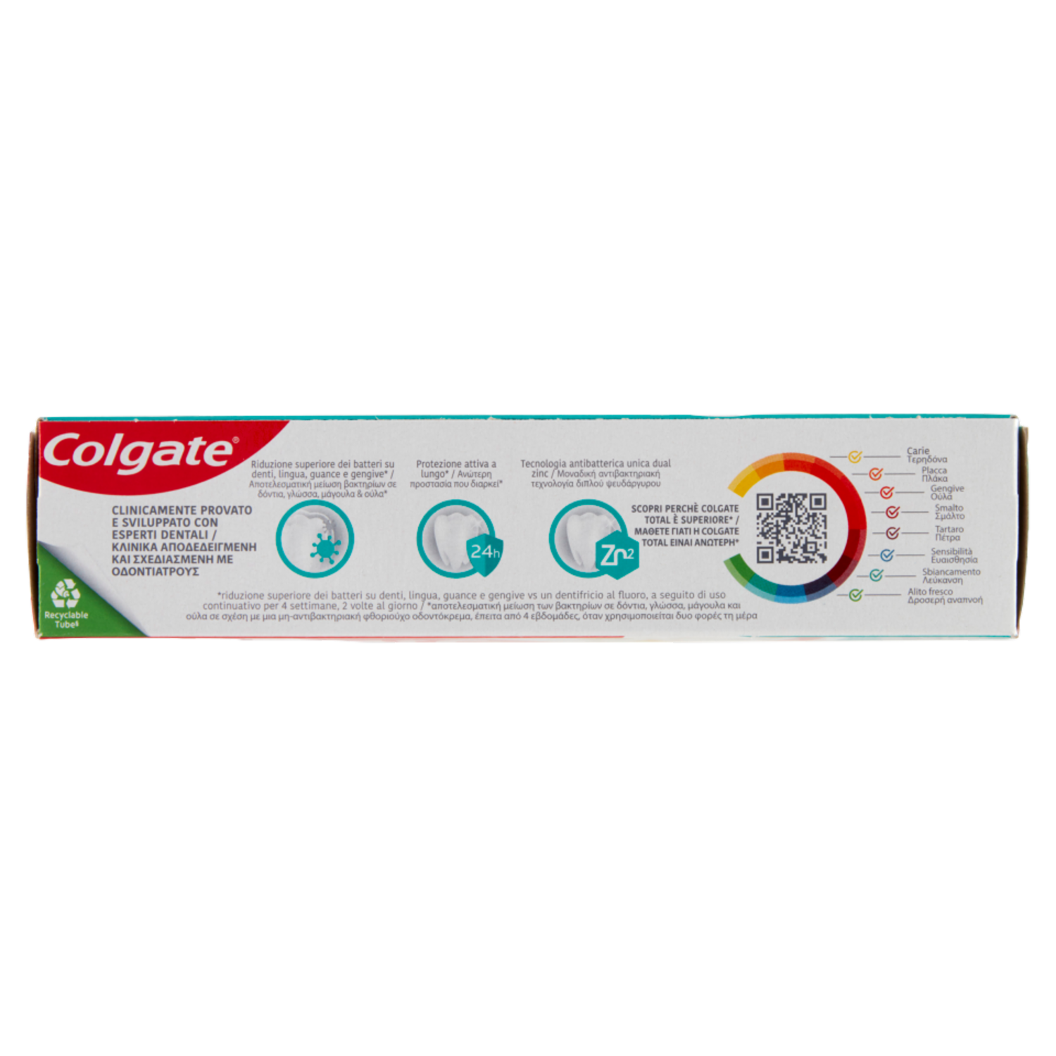 Clinicamente provato e sviluppato con esperti dentali Riduzione superiore dei batteri su denti, lingua, guance e gengive* Protezione attiva a lungo* Tecnologia antibatterica unica dual zinc Scopri perchè Colgate Total è superiore* - Carie - Placca - Gengive - Smalto - Tartaro - Sensibilità - Sbiancamento - Alito fresco *riduzione superiore dei batteri su denti, lingua, guance e gengive vs un dentifricio al fluoro, a seguito di uso continuativo per 4 settimane, 2 volte al giorno.