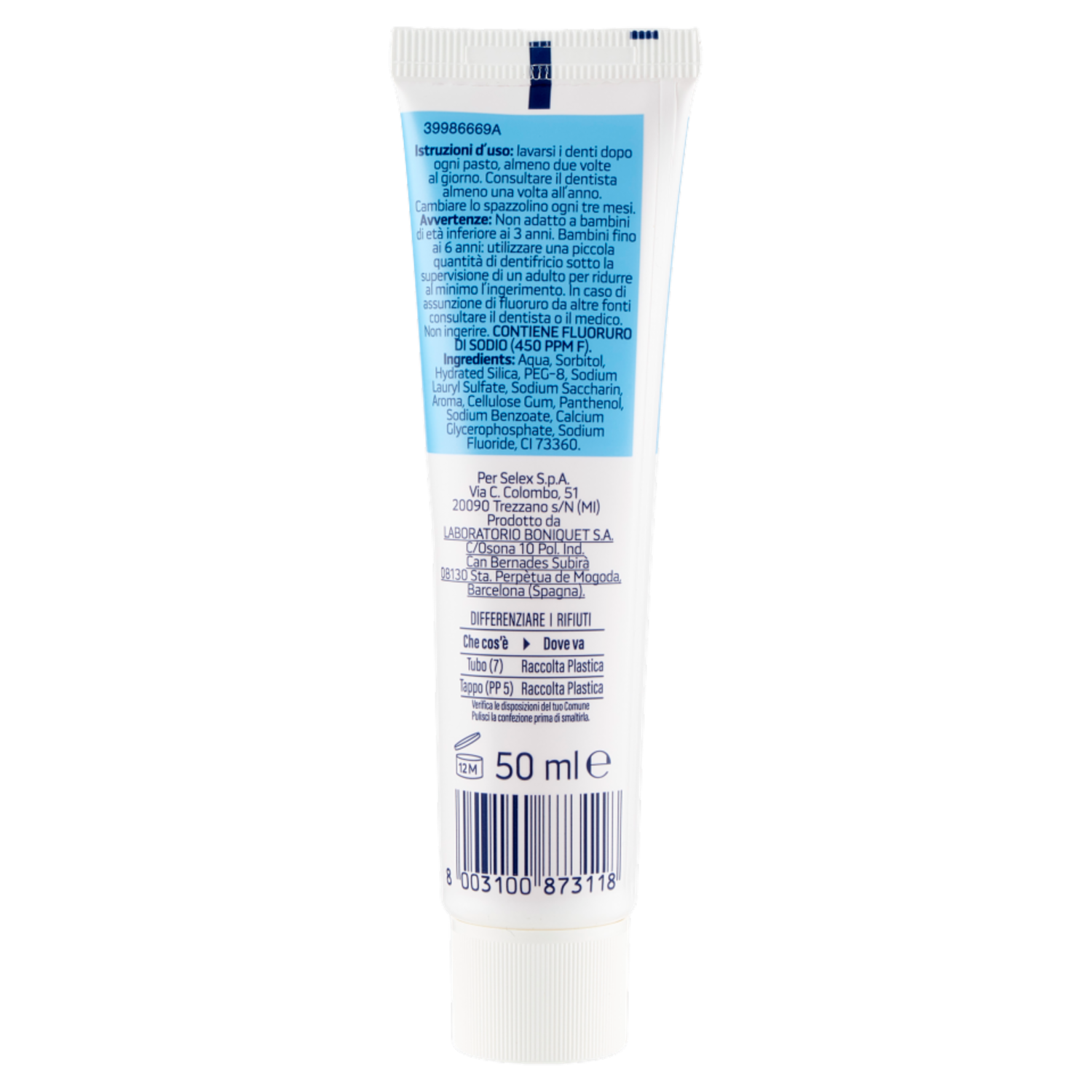 Avvertenze: Non adatto a bambini di età inferiore ai 3 anni. Bambini fino ai 6 anni: utilizzare una piccola quantità di dentifricio sotto la supervisione di un adulto per ridurre al minimo l'ingerimento. In caso di assunzione di fluoruro da altre fonti consultare il dentista o il medico. Non ingerire. CONTIENE FLUORURO DI SODIO (450 PPM F).