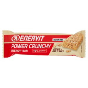 Enervit Power Crunchy Bar. Barretta a base di fiocchi di soia e avena con magnesio e vitamina B1. Con biscotti e fiocchi di avena. Senza glutine