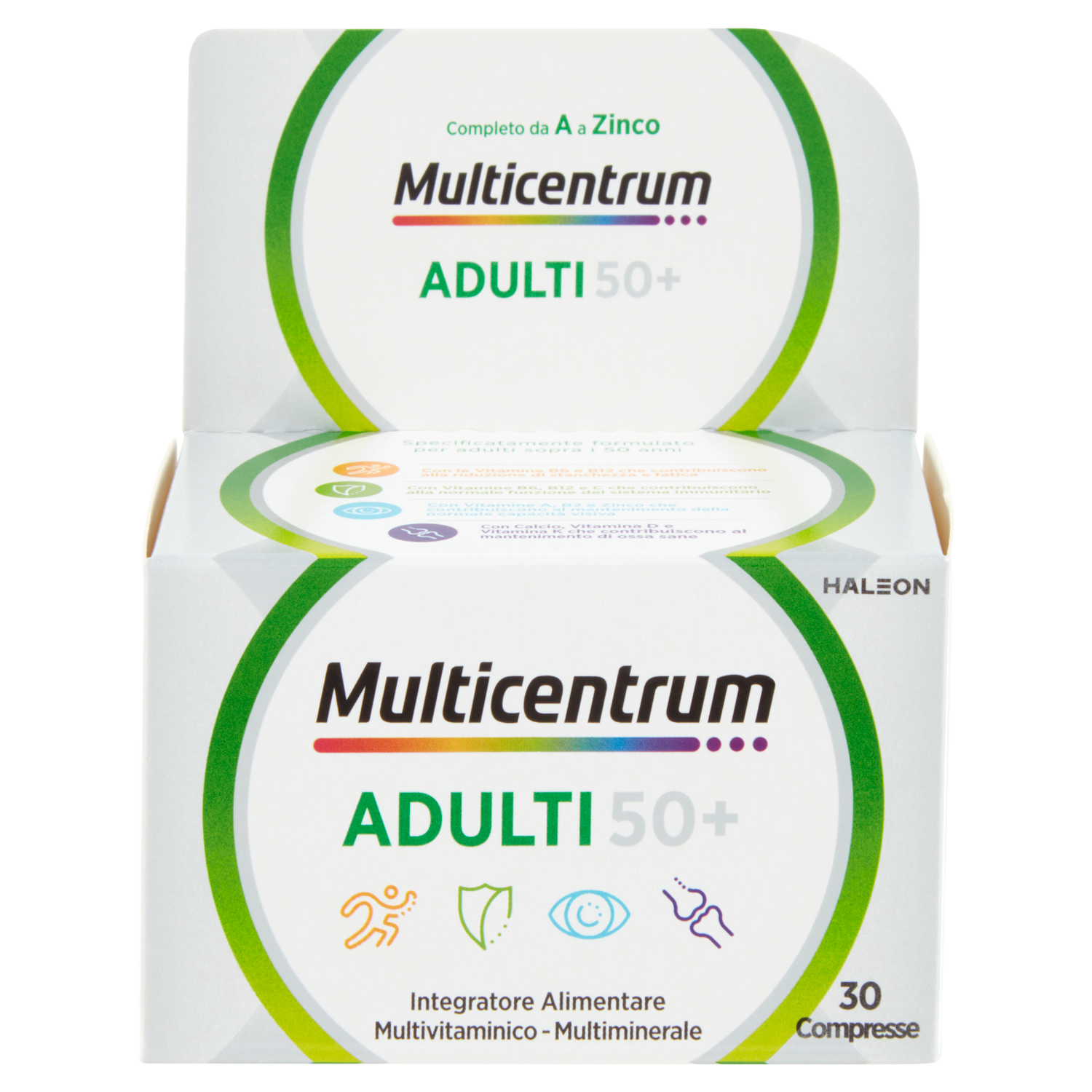 Senza glutine Senza zuccheri Specificatamente formulato per adulti sopra i 50 anni Con le Vitamine B6 e B12 che contribuiscono alla riduzione di stanchezza e fatica Con Vitamine B6, B12 e C che contribuiscono alla normale funzione del sistema immunitario Con Vitamine A, B2 e Zinco che contribuiscono al mantenimento della normale capacità visiva Con Calcio, Vitamina D e Vitamina K che contribuiscono al mantenimento di ossa sane Multicentrum Adulti 50+ è un integratore multivitaminico-multiminerale completo, formulato per adulti sopra i 50 anni.