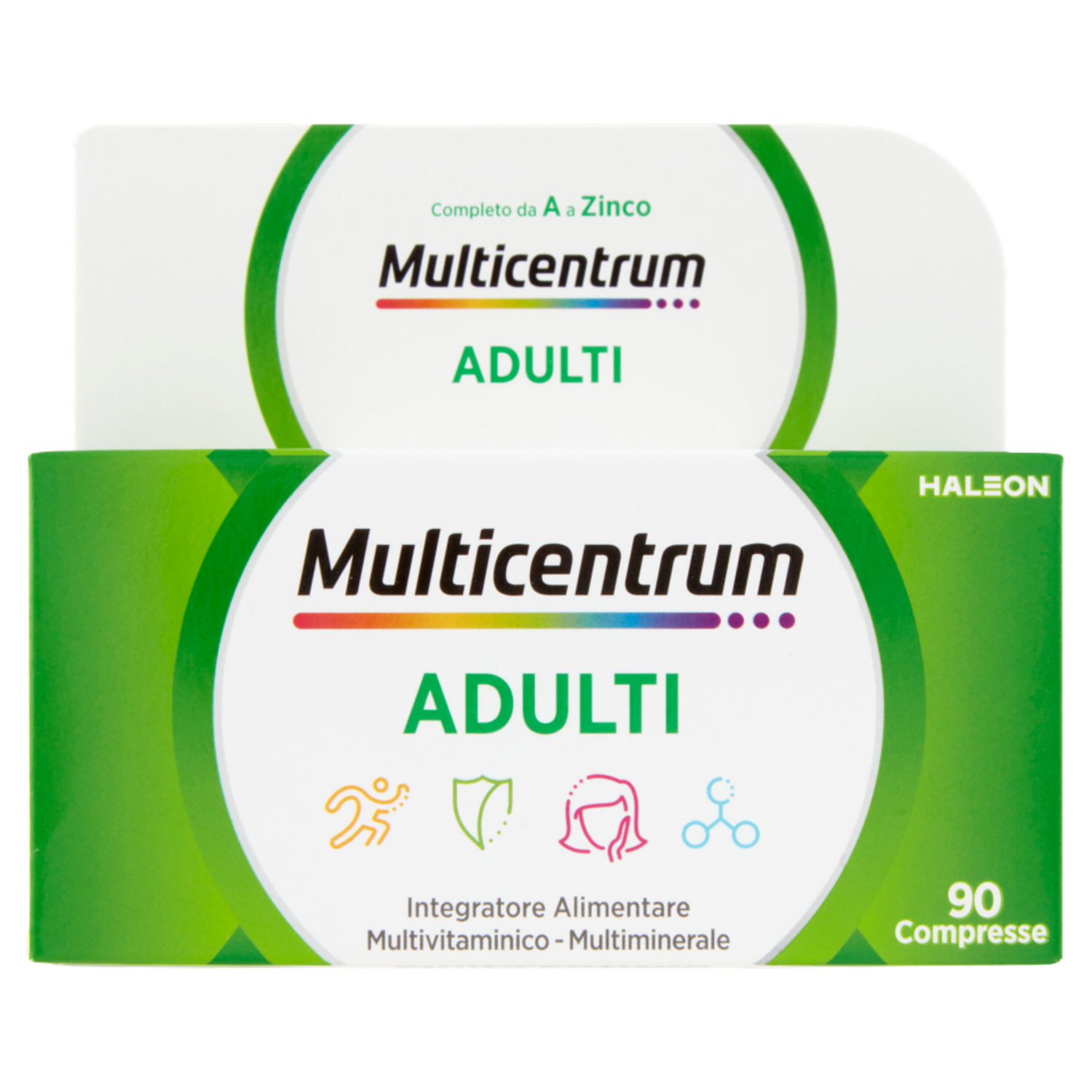 Senza glutine Senza zuccheri Specificatamente formulato per adulti Con le Vitamine B6 e B12 che contribuiscono alla riduzione di stanchezza e fatica Con Vitamine B6, B12 e C che contribuiscono alla normale funzione del sistema immunitario Con Vitamine A, B2 e Biotina che contribuiscono al mantenimento di una pelle sana Con Vitamine C, E e Selenio che contribuiscono alla protezione delle cellule dallo stress ossidativo Multicentrum Adulti è un integratore multivitaminico-multiminerale completo, formulato per adulti