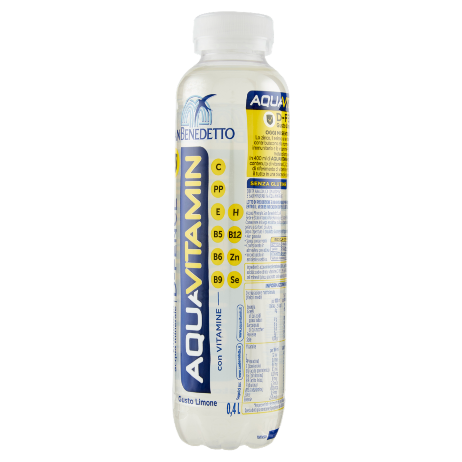 Oggi mi sento in forma! Lo zinco, il selenio e le vitamine B12, B6, B9 e C contribuiscono alla normale funzione del sistema immunitario e le vitamine PP, B5 e H concorrono al metabolismo energetico. In 400 ml di Aquavitamin D-Fence trovi un alto contenuto di vitamina C, il 20% del valore nutrizionale di riferimento di vitamine PP, E, B5, B6, B9, H, B12, il tutto in una piacevole bevanda al gusto limone. Senza glutine - Non gassata - Senza conservanti