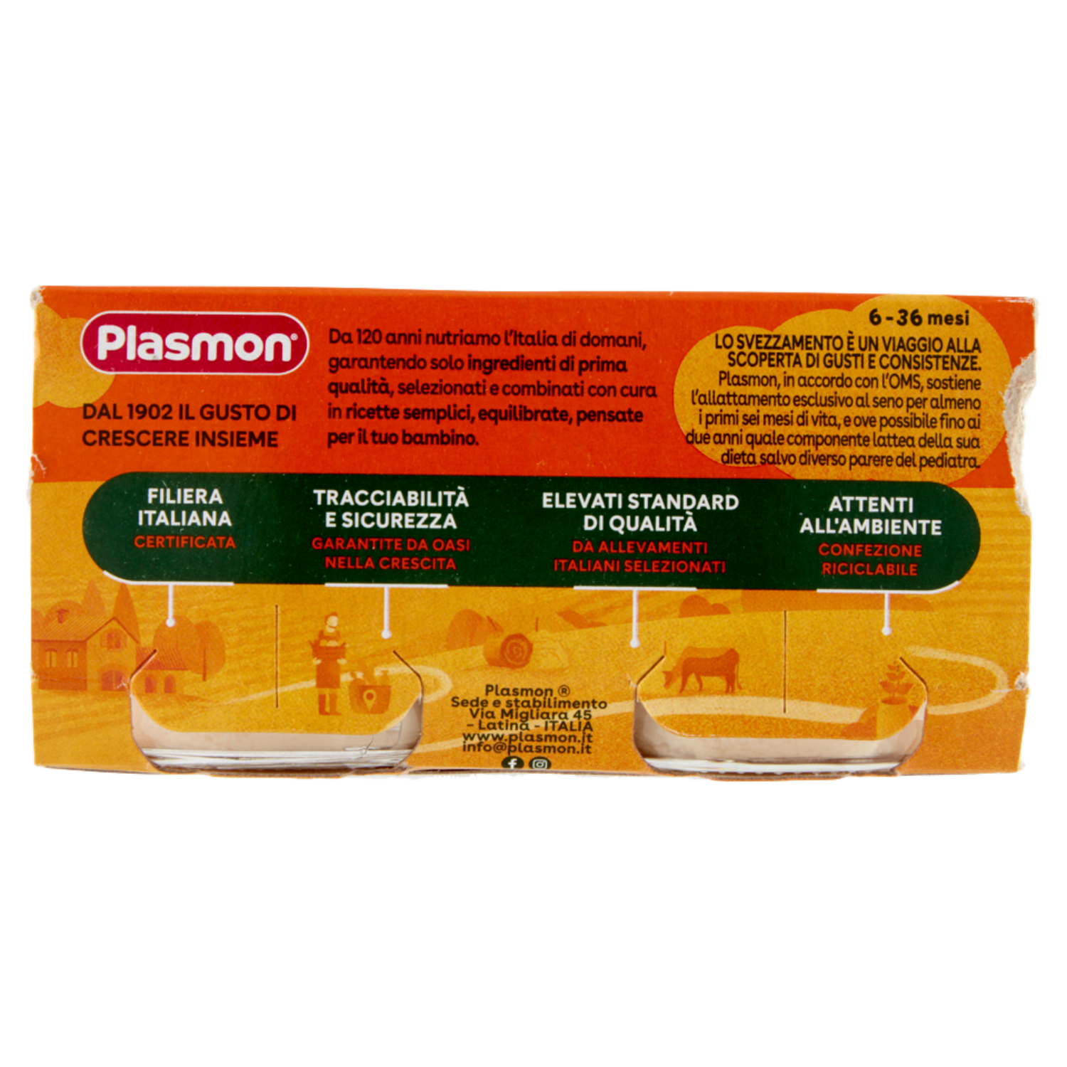 6 - 36 mesi Lo svezzamento è un viaggio alla scoperta di gusti e consistenze. Plasmon, in accordo con l'OMS, sostiene l'allattamento esclusivo al seno per almeno i primi sei mesi di vita, e ove possibile fino ai due anni quale componente lattea della sua dieta salvo diverso parere del pediatra. Filiera italiana certificata Tracciabilità e sicurezza garantite da Oasi nella crescita Elevati standard di qualità da allevamenti italiani selezionati Attenti all'ambiente confezione riciclabile Prodotto in Italia - Con ingredienti italiani Filiera certificata - In collaborazione con il Ministero delle Politiche Agricole, Alimentari e Forestali Ricetta semplice e cottura al vapore Acqua di cottura Tagli di carne italiana selezionati Farina di riso Succo di limone Solo quello che vedi trasparenza dal campo al vasetto - Senza amidi e aromi aggiunti - Senza sale e olio aggiunti - Senza coloranti* e conservanti* *Come per legge Senza glutine