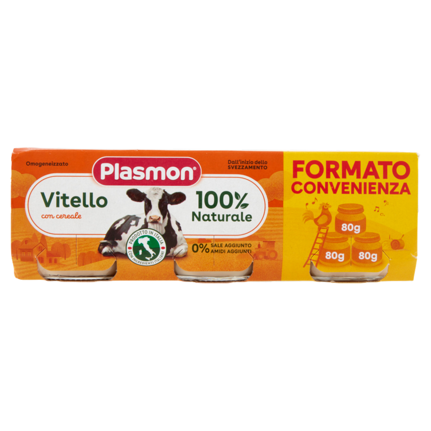 6 - 36 mesi Lo svezzamento è un viaggio alla scoperta di gusti e consistenze. Plasmon, in accordo con l'OMS, sostiene l'allattamento esclusivo al seno per almeno i primi sei mesi di vita, e ove possibile fino ai due anni quale componente lattea della sua dieta salvo diverso parere del pediatra. Filiera italiana certificata Tracciabilità e sicurezza garantite da Oasi nella crescita Elevati standard di qualità da allevamenti italiani selezionati Attenti all'ambiente confezione riciclabile Prodotto in Italia - Con ingredienti italiani Filiera certificata - In collaborazione con il Ministero delle Politiche Agricole, Alimentari e Forestali Ricetta semplice e cottura al vapore Acqua di cottura Vitello 100% italiano Farina di riso Succo di limone Solo quello che vedi Trasparenza dal campo al vasetto - Senza amidi e aromi aggiunti - Senza sale e olio aggiunti - Senza coloranti* e conservanti* *Come per legge Senza glutine