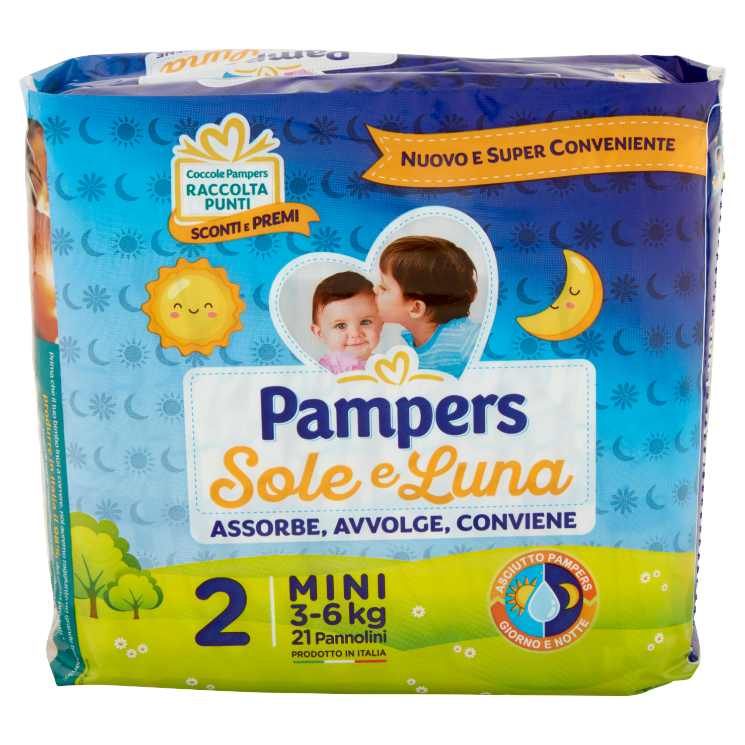 Assorbe, avvolge, conviene Nuovo Pampers Sole&Luna Scopri l'assorbenza del Pampers più conveniente: con un look tutto nuovo accompagna il tuo bimbo nelle avventure di giorno e nei sogni di notte. Con orecchiette elastiche Con nuove grafiche Asciutto Pampers - Giorno e notte