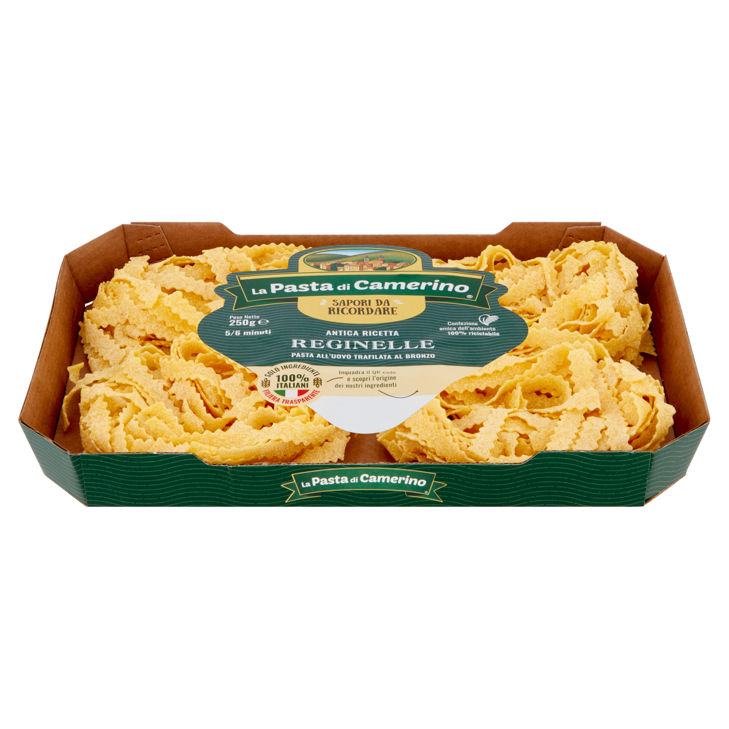 La Pasta di Camerino Sapori da ricordare Sulle colline dell'entroterra marchigiano la brezza del Mare Adriatico si mescola all'aria pura e alla terra genuina dei Monti Sibillini. È qui che nasce La Pasta di Camerino, ruvida e porosa come quella fatta in casa, realizzata con cura e nel rispetto dei migliori metodi artigianali. Perfetta per catturare i sughi ed esaltare ogni piatto. Unica per tradizione perché: - Solo ingredienti di prima qualità di filiera 100% italiana - Fedele alla ricetta originale con ben 8 uova per ogni kg di farina - Triplo impasto lento - Trafilatura al bronzo - Essiccazione lentissima a basse temperature Riscopri i sapori che vivono nella memoria, il benessere che deriva da una migliore qualità della vita e da relazioni genuine e autentiche, come quelle di una volta. Scopri i nostri valori su www.lapastadicamerino.it Da sempre siamo fieri di dichiarare la provenienza degli ingredienti di alta qualità usati per i nostri prodotti. Inquadra questo QR code con il tuo smartphone o visita il sito filiera.lapastadicamerino.it e inserisci il lotto numerico che trovi stampato nel riquadro bianco. Inquadra il QR code e scopri l'origine dei nostri ingredienti