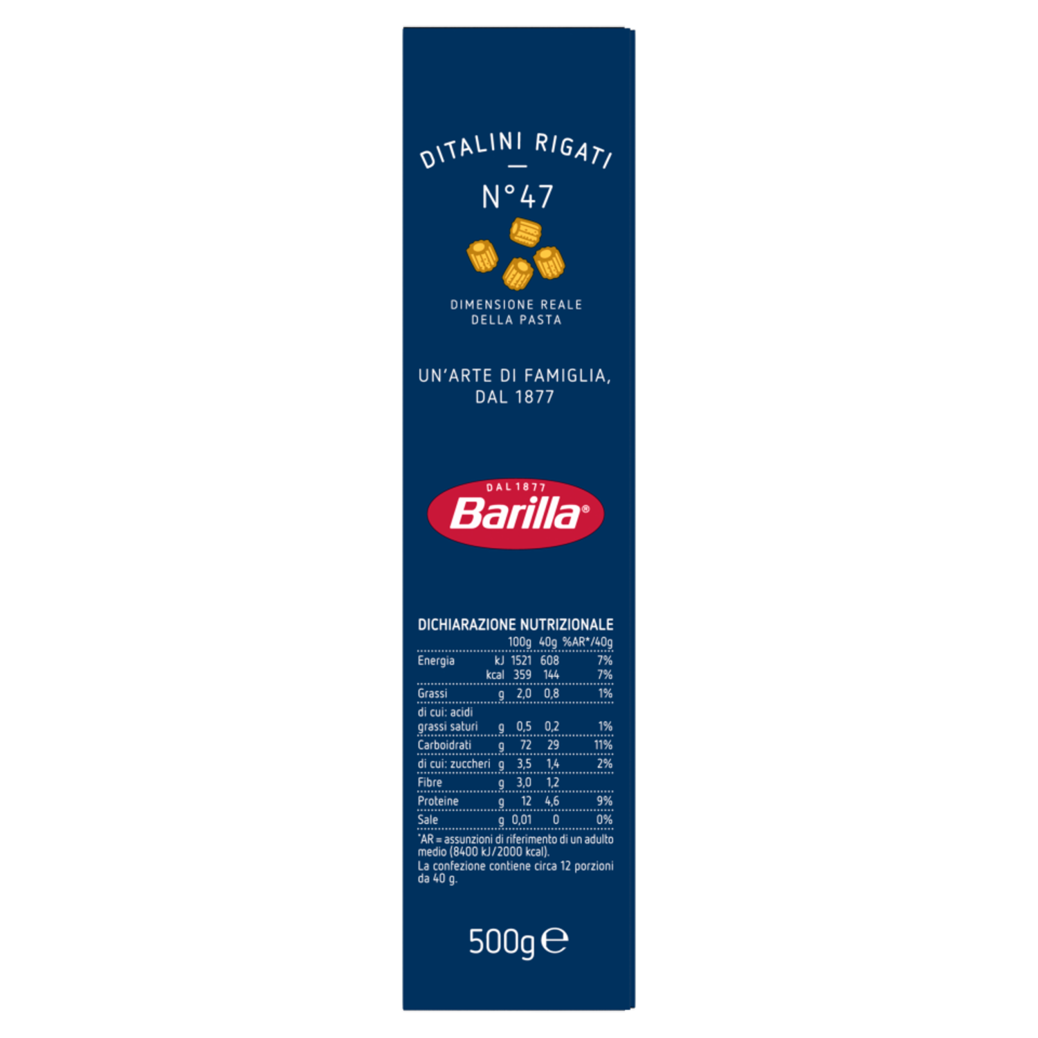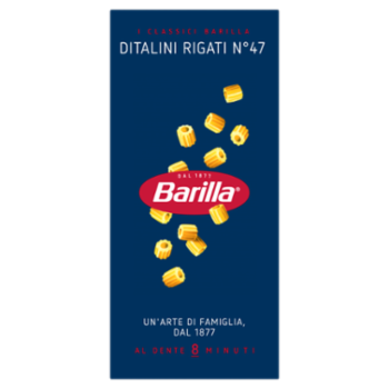 Barilla Dal 1877 Grani selezionati 100% italiani Siamo fieri di essere al fianco delle organizzazioni di 8.000 agricoltori d'Italia che coltivano grano duro di qualità per la nostra pasta. A Parma dal 1877 A Parma il buon cibo è tradizione ed eccellenza gastronomica, gioia di vivere e cultura: qui è dove siamo nati. Il domani è oggi La pasta Barilla la conosci da sempre: perciò abbiamo tolto la finestra trasparente, risparmiando 126.000 kg di plastica all'anno.* Un gesto d'amore Ogni giorno ci impegniamo a darti la nostra pasta migliore, sempre al dente, per far felice chi ami. *rimozione finestra dai Classici Barilla; valore calcolato sulle confezioni in cartoncino vendute nel 2020. Scopri di più su barilla.com/box. Per noi la qualità è una tradizione di famiglia dal 1877. www.barilla.it