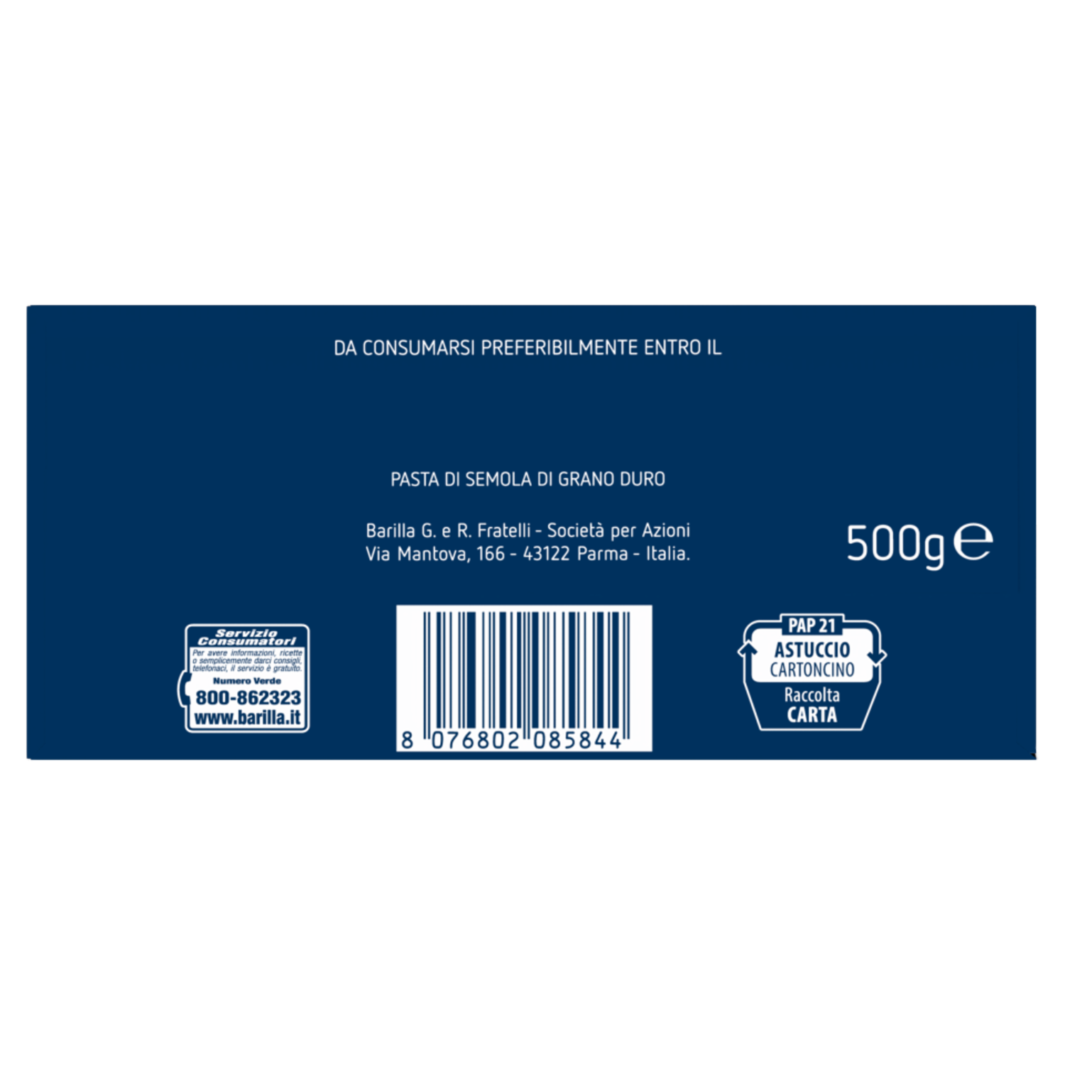 Barilla G. e R. Fratelli - Società per Azioni Via Mantova, 166 43122 Parma Italia Prodotto nello stabilimento indicato con la lettera fra parentesi vicino alla data: (A) Parma - Via Mantova, 166 (F) Foggia - S.S. 16 km 684+300 (E) Marcianise (Caserta) - S.S. 87 km 20+500 (AB) Polvica di Nola (Napoli) - Z.I. di Nola