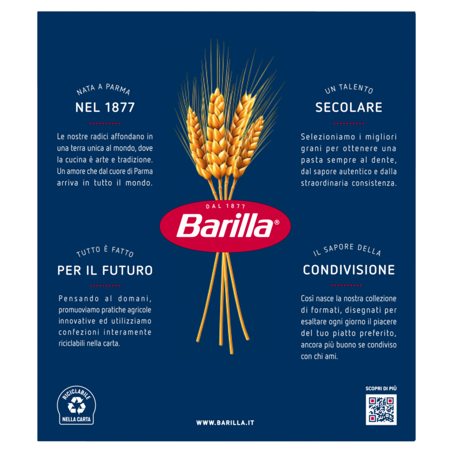 Barilla Dal 1877 Grani selezionati 100% italiani Siamo fieri di essere al fianco delle organizzazioni di 8.000 agricoltori d'Italia che coltivano grano duro di qualità per la nostra pasta. A Parma dal 1877 A Parma il buon cibo è tradizione ed eccellenza gastronomica, gioia di vivere e cultura: qui è dove siamo nati. Il domani è oggi La pasta Barilla la conosci da sempre: perciò abbiamo tolto la finestra trasparente, risparmiando 126.000 kg di plastica all'anno.* Un gesto d'amore Ogni giorno ci impegniamo a darti la nostra pasta migliore, sempre al dente, per far felice chi ami. *rimozione finestra dai Classici Barilla; valore calcolato sulle confezioni in cartoncino vendute nel 2020. Scopri di più su barilla.com/box. Per noi la qualità è una tradizione di famiglia dal 1877. www.barilla.it