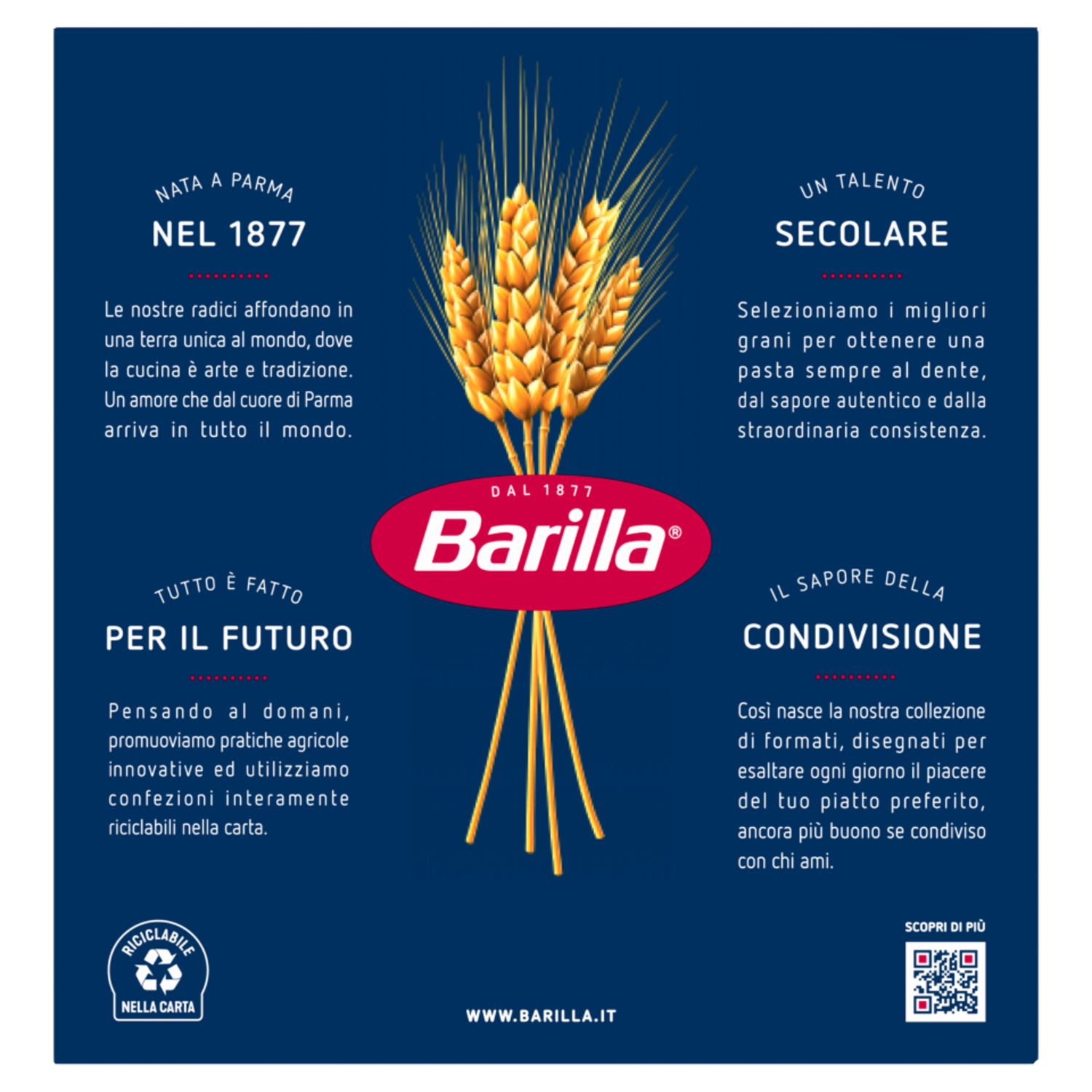 Barilla Dal 1877 Grani selezionati 100% italiani Siamo fieri di essere al fianco delle organizzazioni di 8.000 agricoltori d'Italia che coltivano grano duro di qualità per la nostra pasta. A Parma dal 1877 A Parma il buon cibo è tradizione ed eccellenza gastronomica, gioia di vivere e cultura: qui è dove siamo nati. Il domani è oggi La pasta Barilla la conosci da sempre: perciò abbiamo tolto la finestra trasparente, risparmiando 126.000 kg di plastica all'anno.* Un gesto d'amore Ogni giorno ci impegniamo a darti la nostra pasta migliore, sempre al dente, per far felice chi ami. *rimozione finestra dai Classici Barilla; valore calcolato sulle confezioni in cartoncino vendute nel 2020. Scopri di più su barilla.com/box. Per noi la qualità è una tradizione di famiglia dal 1877. www.barilla.it