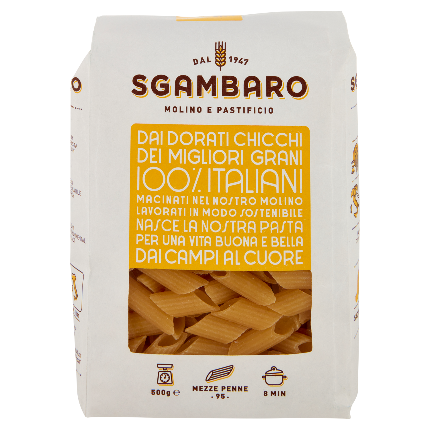 Sgambaro Dal 1947 Molino e pastificio 2001-2021 Vent'anni di filiera italiana Da 20 anni 100% grano italiano Molino unito al pastificio Energia verde Impronta ambientale leggera