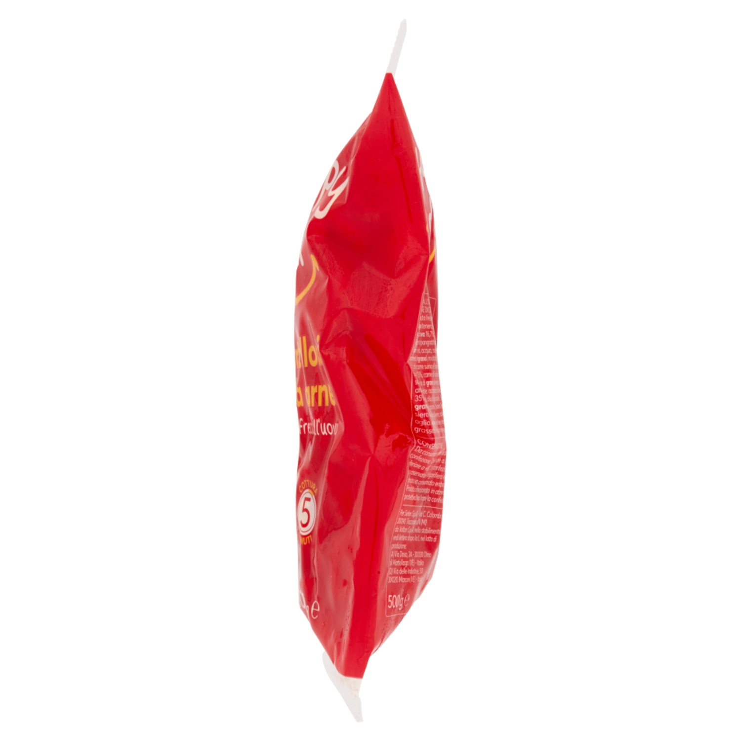 Ripieno 30%: pangrattato (farina di grano tenero, acqua, sale, farine di frumento (grano) maltato), prodotto a base di carne suina e bovina (carne di suino 47,5%, carne di bovino 47,5%, sale, farina di grano tenero, aromi, antiossidante: ascorbato di sodio) 35%, acqua, olio di girasole, farina di grano tenero, aromi, burro (latte), siero di latte in polvere, sale, spezie, aglio