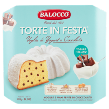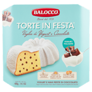 Prodotto dolciario da forno a lievitazione naturale, con gocce di cioccolato e preparato con yogurt*. Con bustina di zucchero impalpabile per decorazione *Lo yogurt, che in cottura perde i fermenti lattici vivi, rende questo dolce molto morbido