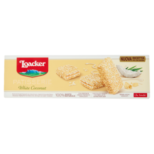 Con Fiocchi di Cocco finemente sminuzzati e cioccolato bianco con 100% Latte Alpino non OGM Senza aromi né coloranti aggiunti Non OGM Nuova ricetta + gusto + sostenibile Più che buono* * La copertura di cioccolato bianco, decorata con fiocchi di cocco delicatamente sminuzzati, abbraccia una deliziosa crema al cocco tra due cialde fragranti. L'aroma esotico delizia il palato e libera la fantasia.