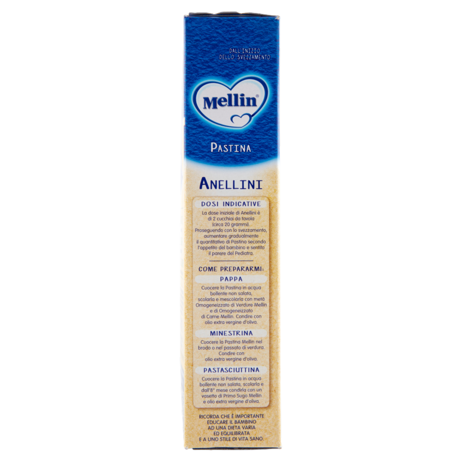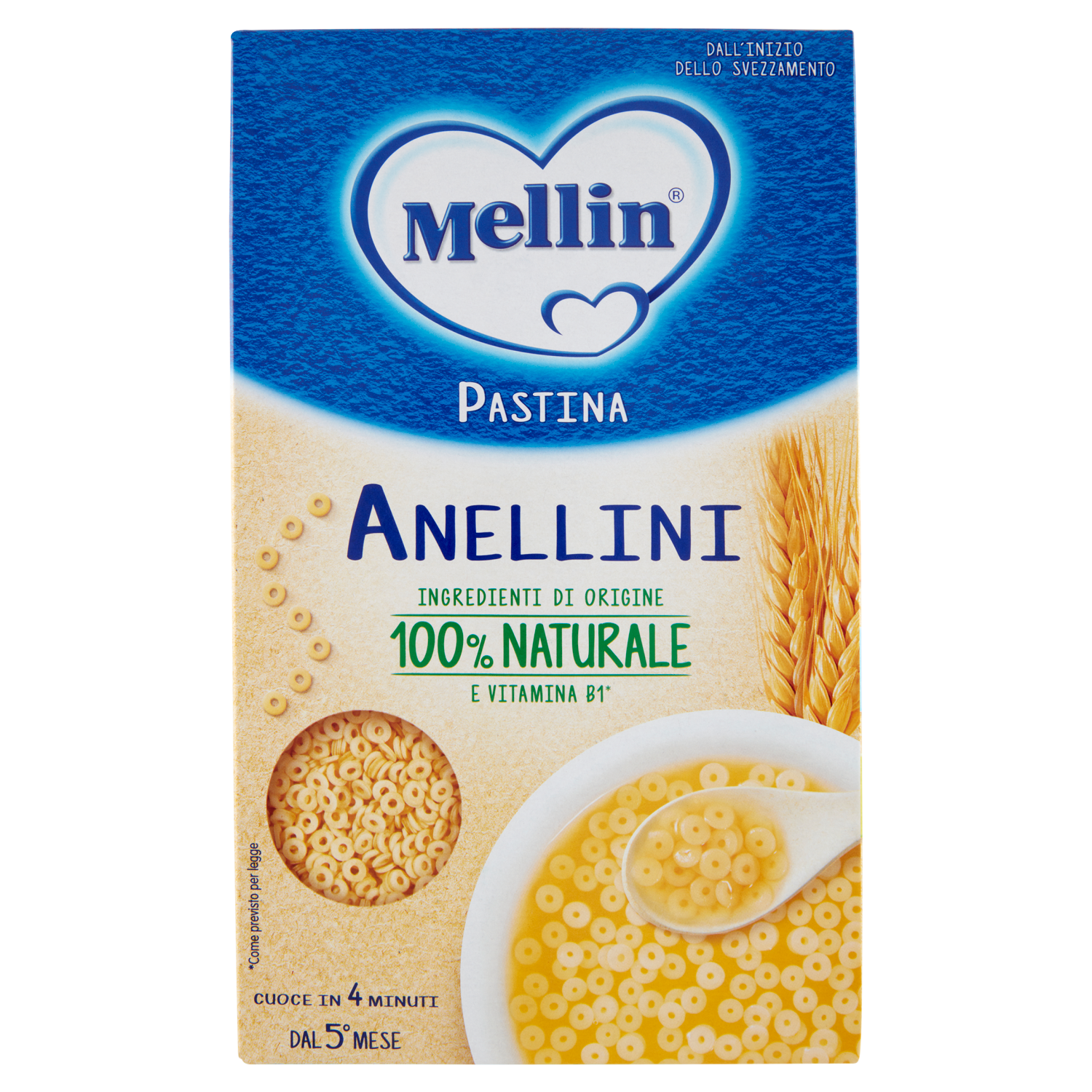 Cuoce in 4 minuti Dosi indicative La dose iniziale di Anellini è di 2 cucchiai da tavola (circa 20 grammi). Proseguendo con lo svezzamento, aumentare gradualmente il quantitativo di Pastina secondo l'appetito del bambini e sentito il parere del Pediatra. Come preparami: Pappa Cuocere la Pastina in acqua bollente non salata, scolarla e mescolarla con metà Omogeneizzato di Verdure Mellin e di Omogeneizzato di Carne Mellin. Condire con olio extra vergine d'oliva. Minestrina Cuocere la Pastina Mellin nel brodo o nel passato di verdura. Condire con olio extra vergine d'oliva. Pastasciuttina Cuocere la Pastina in acqua bollente non salata, scolarla e dall'8° mese condirla con un vasetto di Primo Sugo Mellin e olio extra vergine d'oliva.