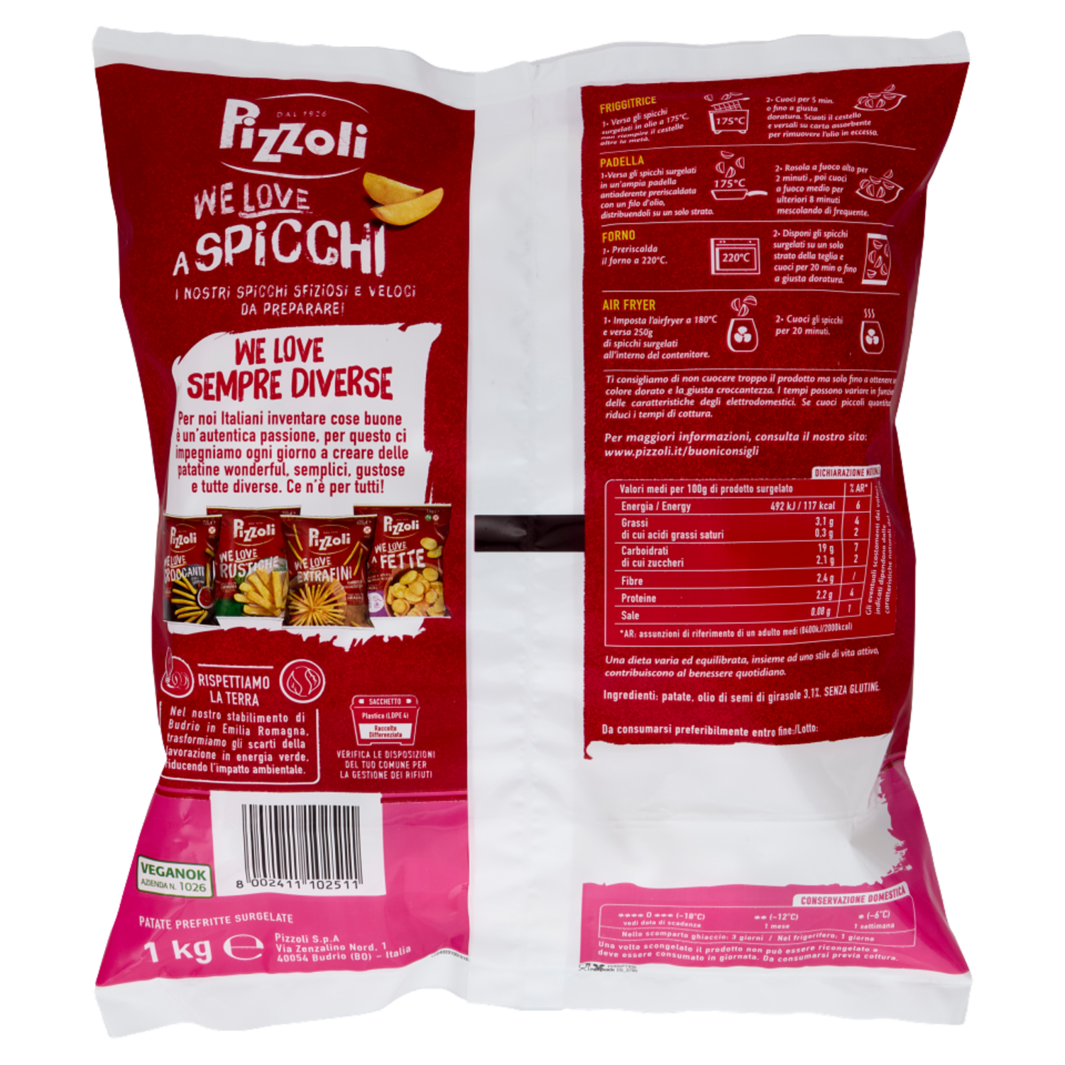In padella: con un filo d'olio 1 Versa gli spicchi surgelati in un'ampia padella antiaderente preriscaldata con un filo d'olio, distribuendoli su un solo strato. 2 Rosola a fuoco alto per 2 minuti circa. 3 Cuoci a fuoco medio per ulteriori 12 minuti mescolando di frequente. In friggitrice: olio a 175° C 1 Versa gli spicchi surgelati, non riempire il cestello oltre la metà e cuoci per 5 minuti o fino a ottenere un colore giallo dorato e la giusta croccantezza. 2 Scuoti il cestello e versa gli spicchi su carta assorbente per rimuovere l'olio in eccesso. In forno 1 Preriscalda il forno a 220°C. 2 Disponi gli spicchi surgelati ben distesi su un solo strato della teglia coperta con un filo d'olio. 3 Cuoci per 22 minuti o fino a ottenere un colore giallo dorato e la giusta croccantezza. I tempi possono variare in funzione delle caratteristiche degli elettrodomestici e delle temperature impostate. Se cuoci piccoli quantitativi riduci i tempi di cottura. Per maggiori informazioni, consulta il nostro sito: www.pizzoli.it/buoniconsigli