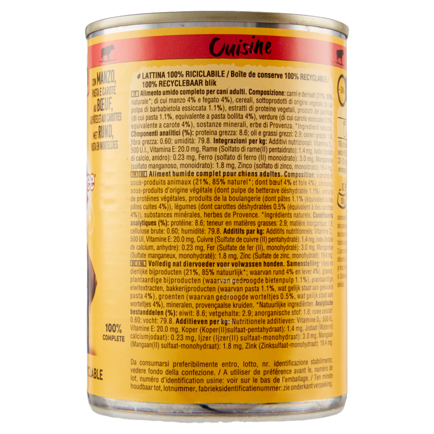 24h - Quantità d'impiego giornaliere raccomandate Peso del cane: 5 kg | Lattina: 375 g - 425 g Peso del cane: 10 kg | Lattina: 600 g - 700 g Peso del cane: 20 kg | Lattina: 1100 g - 1200 g Peso del cane: 30 kg | Lattina: 1500 g - 1600 g 100 g di alimento umido possono essere sostituiti da 22 - 23 g di alimento secco Pedigree. 83 kcal / 100 g Quantità d'impiego e modalità d'uso: Calcolare le calorie derivanti dagli snack. Regola la quantità di alimento in base alle esigenze del tuo cane. Come? Visita il nostro sito. Lasciare sempre a disposizione dell'acqua fresca. Servire a temperatura ambiente, conservare in frigorifero per 2 giorni.