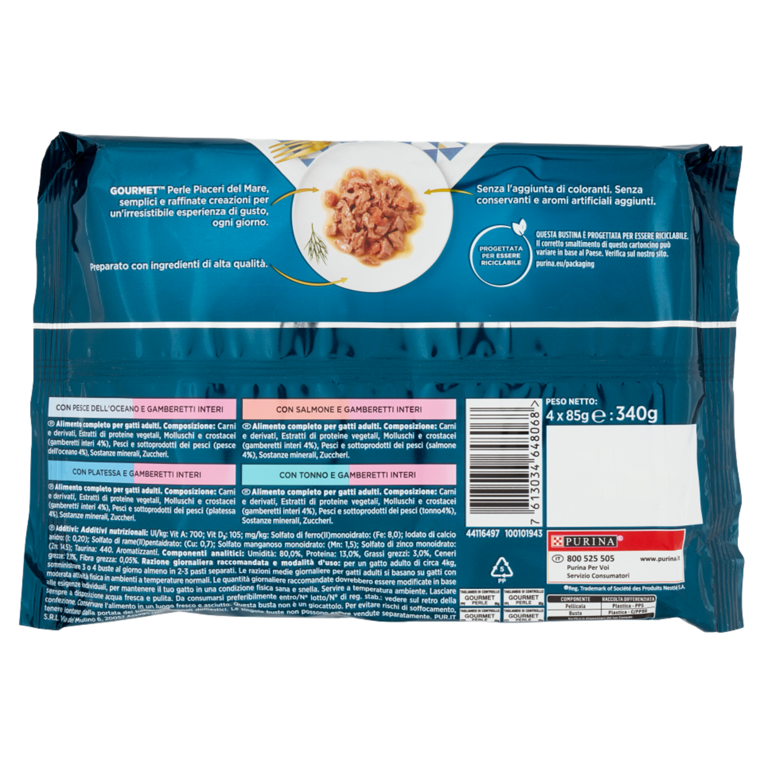 GOURMET Perle Piaceri del Mare, semplici e raffinate creazioni per un'irresistibile esperienza di gusto, ogni giorno. Senza l'aggiunta di coloranti. Senza conservanti e aromi artificiali aggiunti. Preparato con ingredienti di alta qualità. Progettata per essere riciclabile Questa bustina è progettata per essere riciclabile. Il corretto smaltimento di questo cartoncino può variare in base al Paese. Verifica sul nostro sito. purina.eu/packaging - Varietà & Risparmio - Con pesce dell'oceano e gamberetti interi - Con salmone e gamberetti interi - Con platessa e gamberetti interi - Con tonno e gamberetti interi - 4x Buste 85g ℮