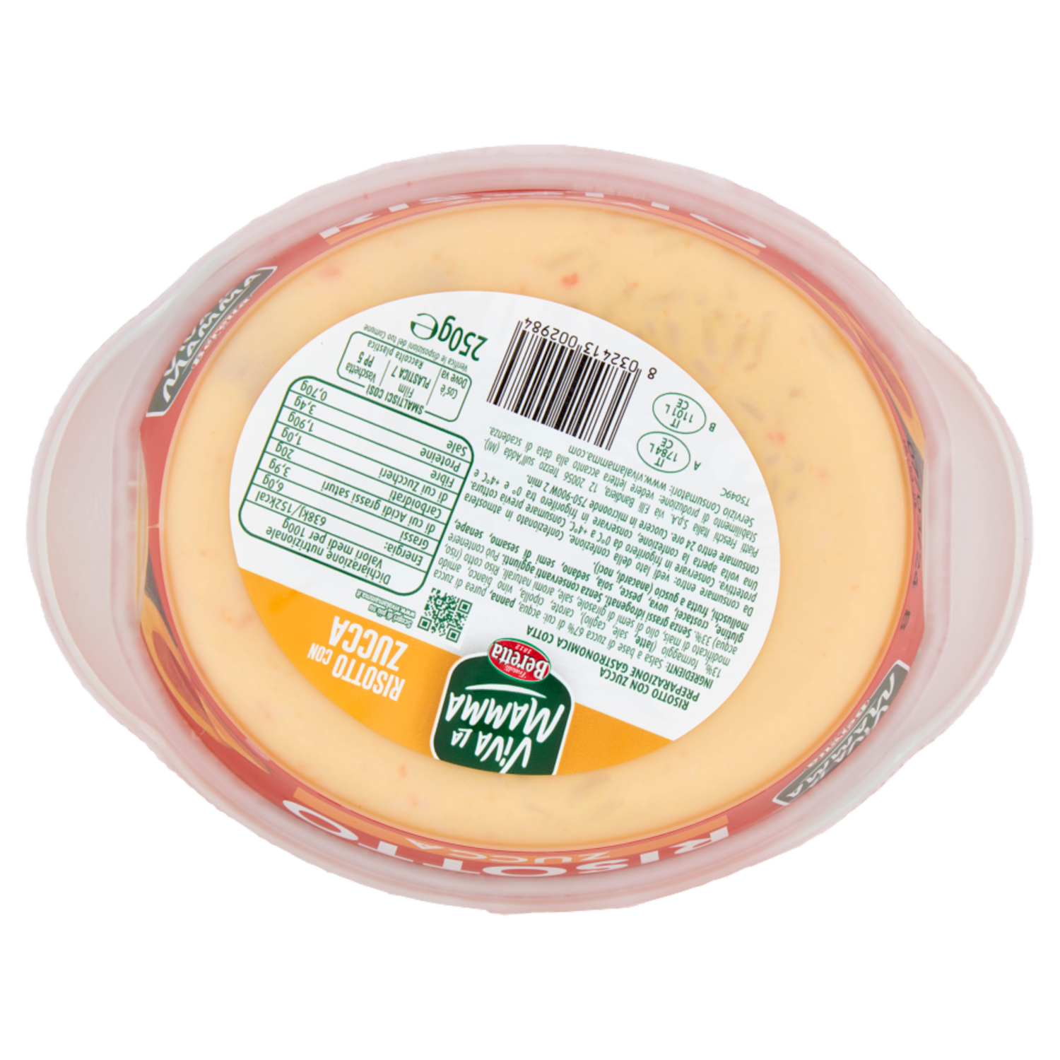 Salsa a base di zucca 67% di cui: acqua, panna, purea di zucca 13%, formaggio (latte, sale, caglio), carote, cipolla, vino bianco, amido modificato di mais, olio di semi di girasole, sale, aromi naturali
