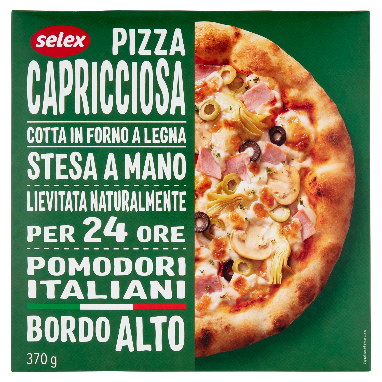 Modalità di preparazione Preriscaldare il forno a 220°C, rimuovere tutti gli imballi, lasciare che la pizza si scongeli a temperatura ambiente ed infine cuocerla sulla griglia, a metà altezza, del forno per 7/9 minuti o almeno fino a quando la mozzarella è ben fusa. Il tempo e la temperatura di cottura possono variare a seconda del forno utilizzato.
