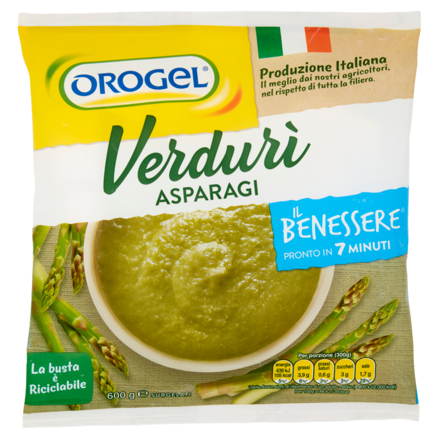 Il Verdurì di Asparagi è proprio come lo fareste a casa: solo asparagi, patate, porro, poco sale e olio extravergine di oliva. Un passato delicato e gustoso, ottimo per ogni occasione. Fonte naturale di fibre. A basso contenuto di grassi. Orogel con te! Per il tuo Benessere. Almeno 5 porzioni di verdura e frutta ogni giorno e un'alimentazione equilibrata, forniscono al tuo organismo tanti principi nutritivi e protettivi tipici dei vegetali. Insieme ad una vita sana e attiva, sono fondamentali per un buono stato di salute. Orogel è alla costante ricerca delle scelte più sostenibili Questa busta è già di dimensioni e spessore ridotti al minimo Questo materiale conserva al meglio il prodotto al suo interno Busta Riciclabile Facile da smaltire nella raccolta della plastica Il suo riciclo darà vita a nuovi oggetti