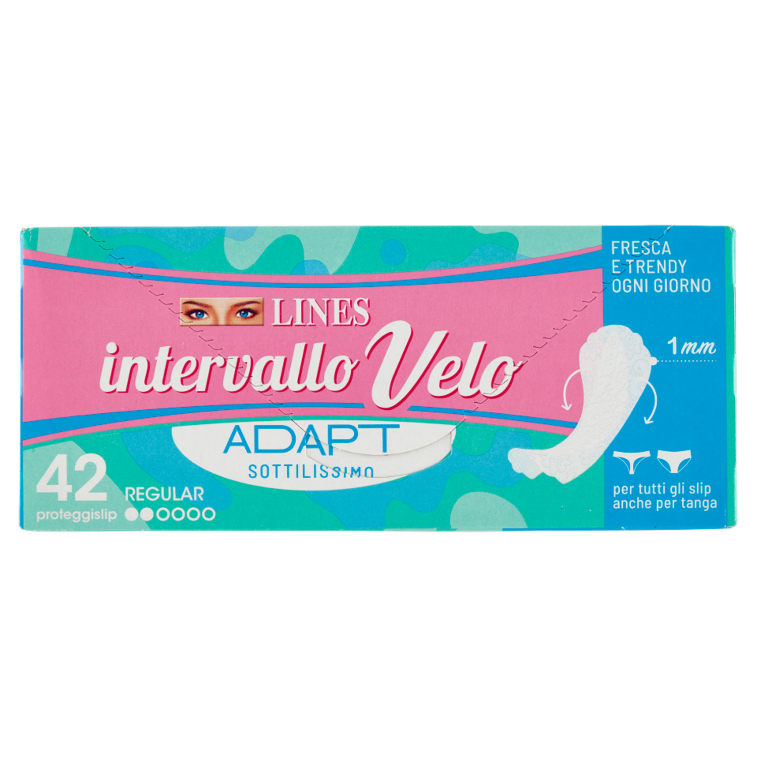 Fresco pulito ogni giorno. Sottilissimo. Intervallo Velo è il proteggislip ipoallergenico sottile e flessibile che si adatta come un velo sul tuo slip. In più, il sistema "Odor Protection" neutralizza gli odori, per farti sentire sicura e fresca ogni giorno. Sottilissimo - 1 mm di Spessore Per tutti i tipi di slip Odor protection Filtrante traspirante