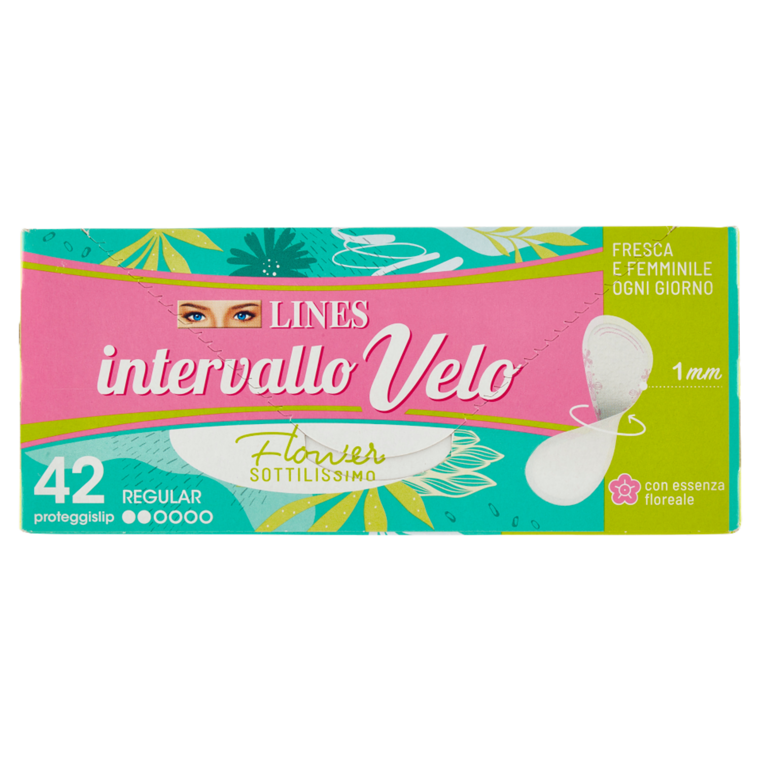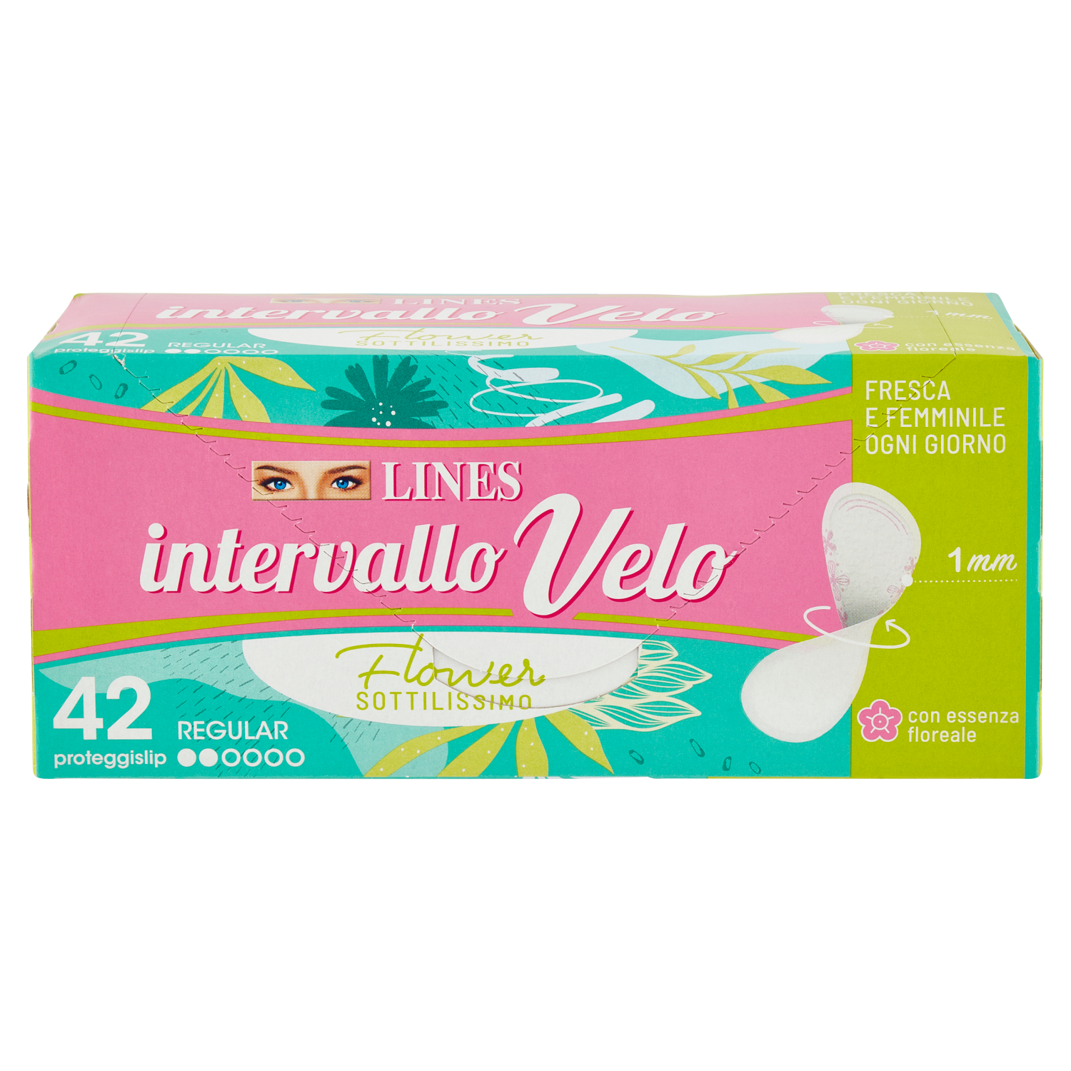 Fresco pulito ogni giorno. Sottilissimo. Intervallo Velo è il proteggislip ipoallergenico sottile e flessibile che si adatta come un velo sul tuo slip. In più, il sistema "Odor Protection" neutralizza gli odori, per farti sentire sicura e fresca ogni giorno. Sottilissimo - 1 mm di Spessore Ultra flessibile Odor protection Filtrante traspirante
