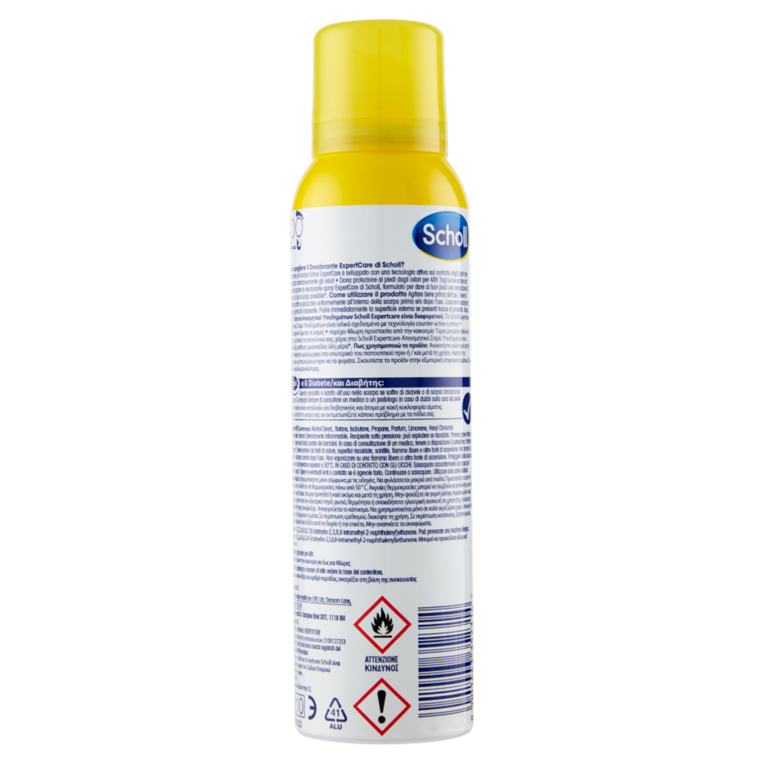 Perché scegliere il Deodorante ExpertCare Scholl? Il deodorante per scarpe Scholl ExpertCare è sviluppato con una tecnologia attiva sul controllo degli odori che: - Neutralizza istantaneamente gli odori - Dona protezione ai piedi dagli odori per 48h Togli le tue scarpe con disinvoltura grazie al deodorante spray ExpertCare di Scholl, formulato per dare ai tuoi piedi una sensazione di freschezza il più a lungo possibile*. *Neutralizza gli odori per 48h