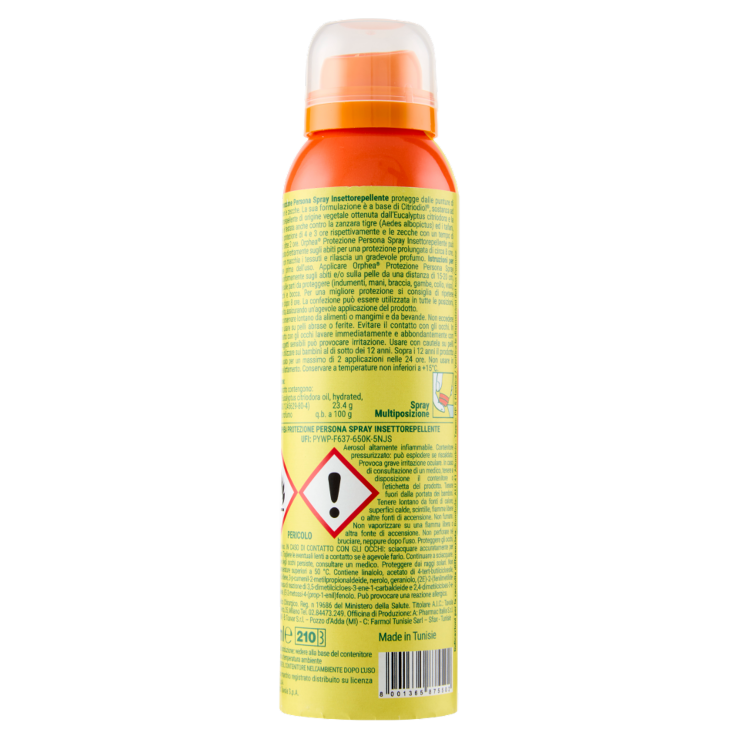 Avvertenze: conservare lontano da alimenti o mangimi e da bevande. Non eccedere nell'uso. Non usare su pelli abrase o ferite. Evitare il contatto con gli occhi. In caso di contatto con gli occhi lavare immediatamente e abbondantemente con acqua. In soggetti sensibili può provocare irritazione. Usare con cautela su pelli delicate. Non utilizzare sui bambini al di sotto dei 12 anni. Sopra i 12 anni il prodotto può essere usato per un massimo di 2 applicazioni nelle 24 ore. Non usare in gravidanza e allattamento. Conservare a temperature non inferiori a +15°C. PERICOLO Orphea Protezione Persona Spray Insettorepellente Aerosol altamente infiammabile. Contenitore pressurizzato: può esplodere se riscaldato. In caso di consultazione di un medico, tenere a disposizione il contenitore o l'etichetta del prodotto. Tenere fuori dalla portata dei bambini. Tenere lontano da fonti di calore, superfici calde, scintille, fiamme libere o altre fonti di accensione. Non fumare. Non vaporizzare su una fiamma libera o altra fonte di accensione. Non perforare né bruciare, neppure dopo l'uso. Proteggere dai raggi solari. Non esporre a temperature superiori a 50 °C. Contiene: linalolo; acetato di 4-tert-butilcicloesile; alfa-esilcinnamaldeide, (R)-p-menta-1,8-diene; 2,4-dimetilcicloes-3-ene-1-carbaldeide; 3-p-cumenil-2-metilpropionaldeide; nerolo; geraniolo. Può provocare una reazione allergica. Presidio Medico Chirurgico. Reg. n 19686 del Ministero della Salute.