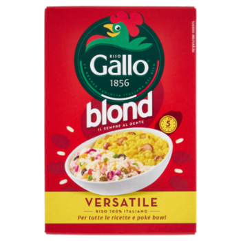 blond il Sempre al Dente blond il riso sempre al dente degli italiani Blond è sinonimo di riso sempre al dente e garanzia di qualità. Siamo stati tra le prime aziende a introdurre il riso parboiled in Italia, il riso "biondo" che ha dato il nome alla linea Blond. Una linea che soddisfa tutte le esigenze in cucina. Ecco le 4 fasi della lavorazione del riso parboiled e i suoi vantaggi 1 Bagno del riso greggio in acqua calda 2 Esposizione al vapore 3 Essiccazione 4 Completa eliminazione dei rivestimenti esterni Grazie al naturale trattamento al vapore, Riso Gallo Blond non scuoce mai e consente una cottura veloce che si adatta a tante modalità di preparazione. Inoltre assorbe meno i grassi del condimento durante la cottura. Blond Versatile Chicchi per tutte le ricette e poké bowl Garantisce tutto il gusto e la tenuta di cottura del riso parboiled in soli 5 minuti! I suoi chicchi corposi e ben sgranati assicurano la perfetta riuscita di ogni ricetta, per una cucina moderna e creativa. Ideale per risotti, risi al sugo, insalate, minestre, piatti unici o per deliziose poké bowl.