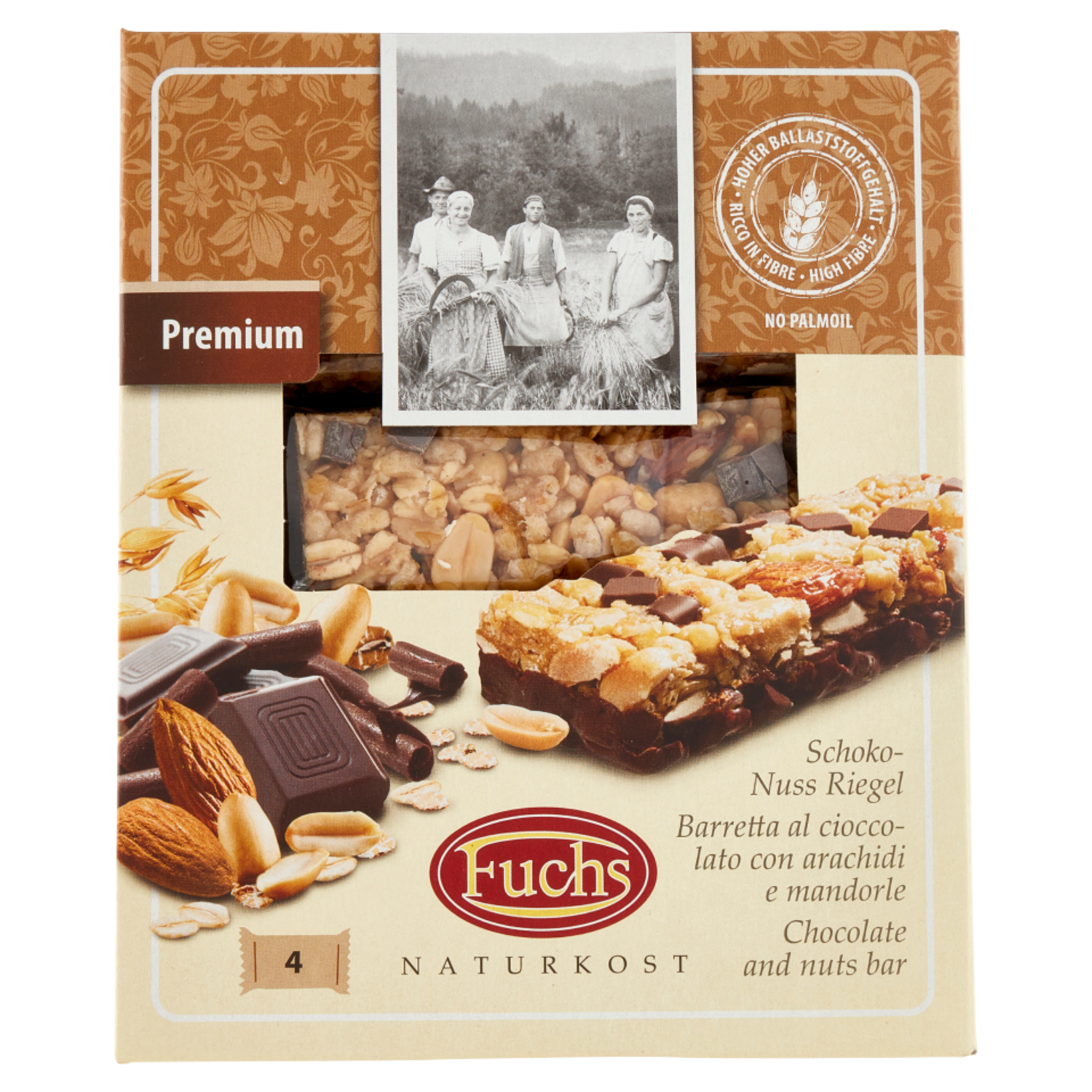 Il delizioso mix di cioccolato fondente, arachidi e mandorle, da gustare ad ogni morso. La rinomata qualitá Fuchs Naturkost in una pratica barretta.