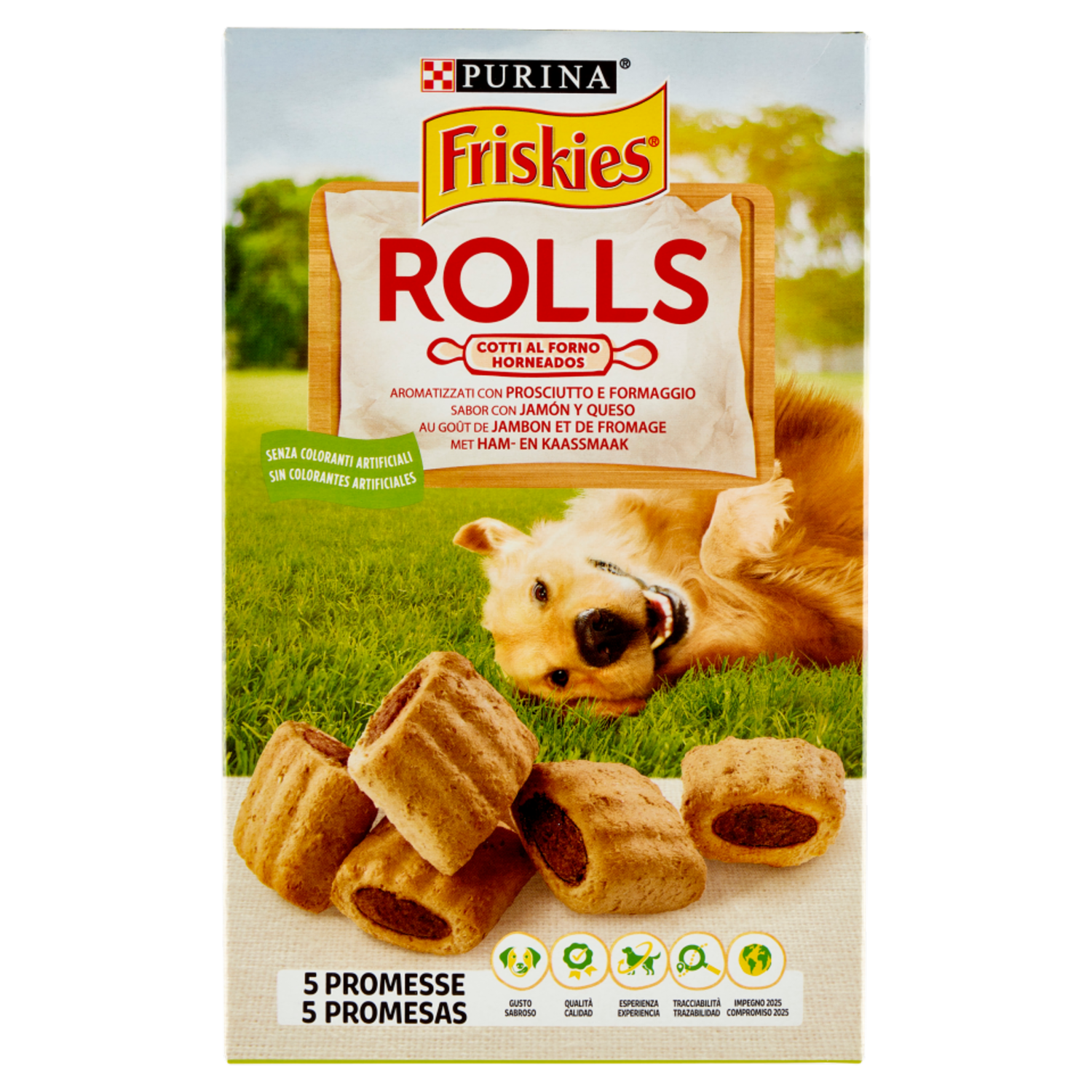 5 Promesse FRISKIES 5 Promesse per la felicità e la salute del tuo cane. Gusto - Qualità - Esperienza - Tracciabilità - Impegno 2025 Scopri di più sulle FRISKIES 5 Promesse su: www.purina-friskies.it Designed to be recyclable Per favore controlla la riciclabilità per il tuo paese sul nostro sito web purina.eu/packaging