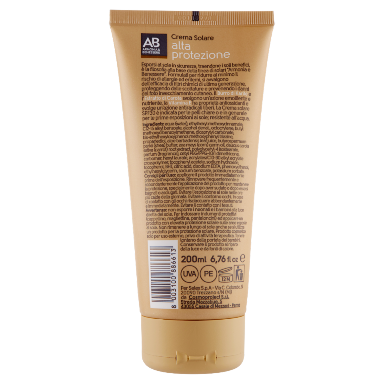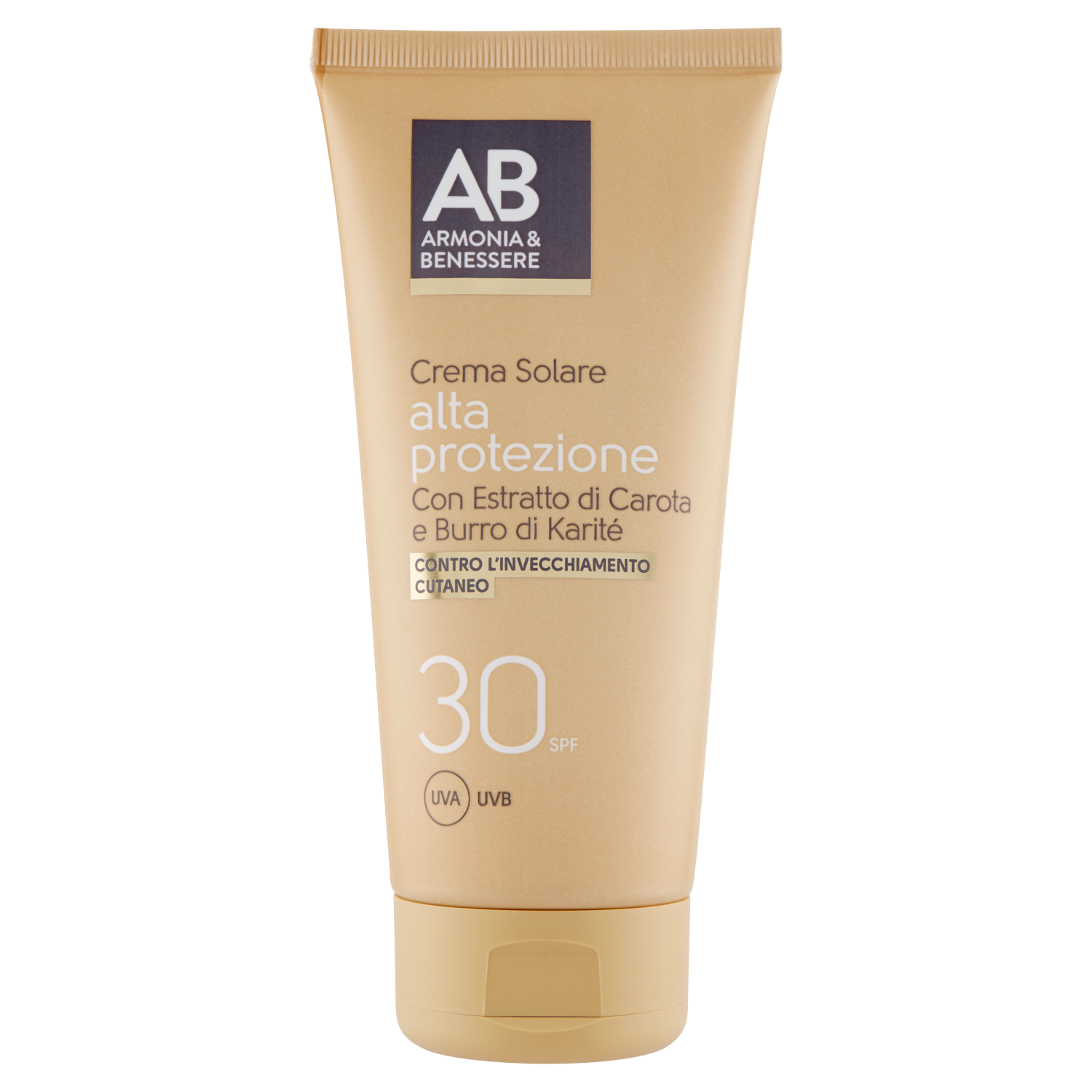 Esporsi al sole in sicurezza, traendone i soli benefici, è la filosofia alla base della linea di solari ''Armonia e Benessere''. Formulati per ridurre al minimo il rischio di allergie ed eritemi, si avvalgono dell'efficacia di filtri chimici di ultima generazione, proteggendo dalle scottature e prevenendo i danni del foto invecchiamento cutaneo. Il Burro di Karité e l'Estratto di Carota svolgono un'azione emolliente e nutriente, la Vitamina E ha proprietà antiossidanti e svolge un'azione antiradicali liberi. La Crema solare SPF30 è indicata per le pelli chiare o e in generale per le prime esposizioni al sole; resistente all'acqua.
