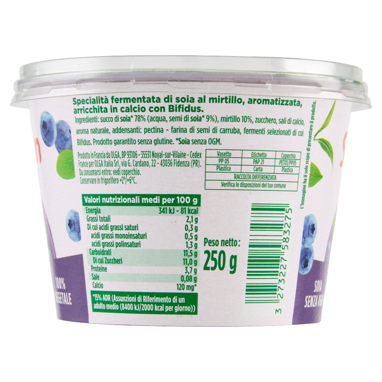 Specialità di soia fermentata al mirtillo, aromatizzata, arricchita in calcio, con Bifidus