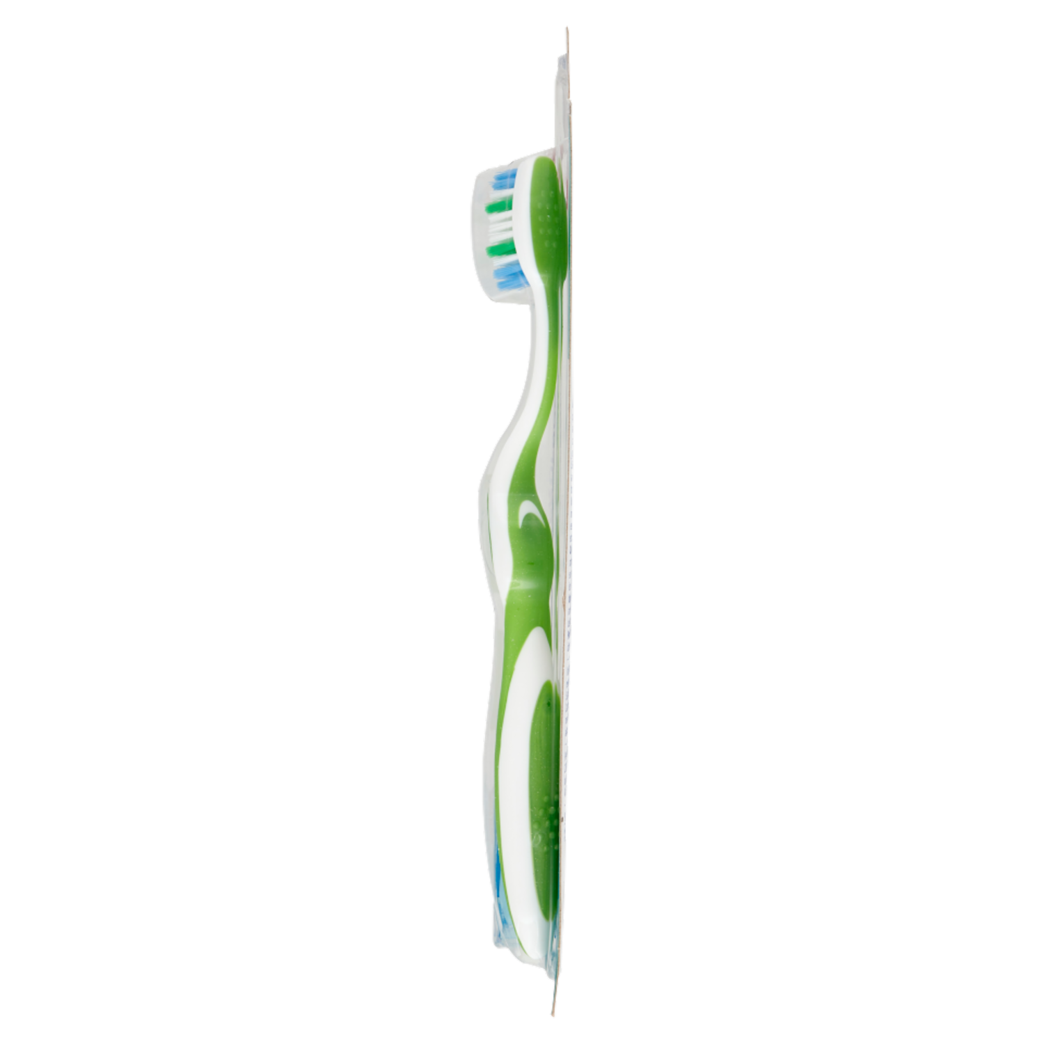 Azione profonda, strumento ideale per una efficace igiene orale quotidiana, aiuta a rimuovere la placca batterica causa principale della carie e dei disturbi gengivali. Setole con taglio multilivello e punte arrotondate penetrano facilmente tra gli spazi interdentali. Il pulisci lingua sul dorso della testina rimuove batteri dalla lingua che possono essere causa disturbi gengivali, carie ed alito cattivo. Collo a tripla angolazione permette una maggiore precisione nello spazzolamento ed una maggiore facilità nel raggiungere le zone più difficili della bocca. Impugnatura ergonomica in gomma antiscivolo agevola il corretto utilizzo dello spazzolino. Prodotto sterilizzato durante la fase di confezionamento.