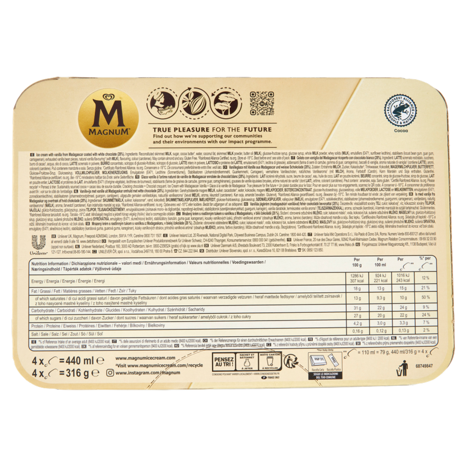 Magnum x la sostenibilità Ogni Magnum è realizzato con cura, con costante a ttenzione ai temi della sostenibilità, utilizzando ingredienti di Alta Qual ità per offrire sempre un'esperienza unica. Vaniglia del Madagascar Il cre moso gelato con estratto di vaniglia del Madagascar, proveniente da fonti g estite responsabilmente, si combina perfettamente con il cioccolato Magnum. Cioccolato croccante Magnum L'esclusivo cioccolato Magnum nasce da semi d i cacao certificati Rainforest Alliance selezionati e tostati con cura, per garantire un piacere autentico e la croccantezza unica di Magnum ad ogni m orso. Dai semi di cacao al morso I semi di cacao Magnum vengono coltivati e raccolti in modo responsabile presso coltivazioni certificate Rainforest Alliance, rispettando l'ambiente e sostenendo i coltivatori locali. Rispet tando le risorse forestali Il legno e la carta utilizzati per la produzione di stecchi e confezioni esterne derivano da foreste gestite in maniera sos tenibile.