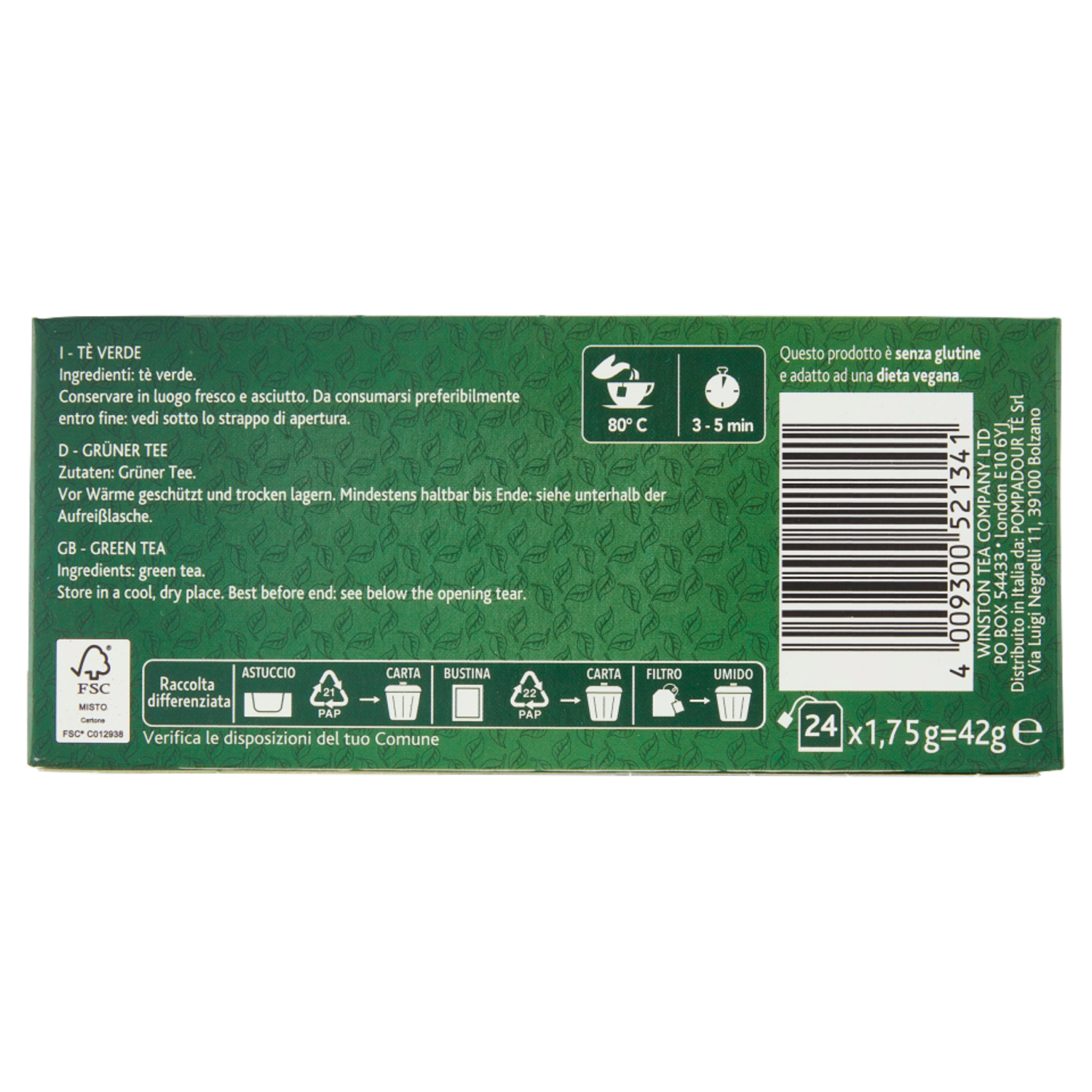 #unsorsomigliore - Astuccio in cartone riciclabile - Bustina in carta riciclabile - Imballi certificati FSC per salvaguardare le foreste - Filtro in cellulosa biodegradabile - Filo in puro cotone senza graffetta in alluminio - Senza microplastiche - Scritta in Braille - Emissioni di CO₂ ridotte e compensate Il tè verde, tra le sue preziose proprietà, possiede un apprezzabile contenuto di polifenoli, antiossidanti naturali molto utili all'organismo. Da sempre, secondo la tradizione orientale il tè verde dona armonia e salute ad anima e corpo. Questo prodotto è senza glutine e adatto ad una dieta vegana.