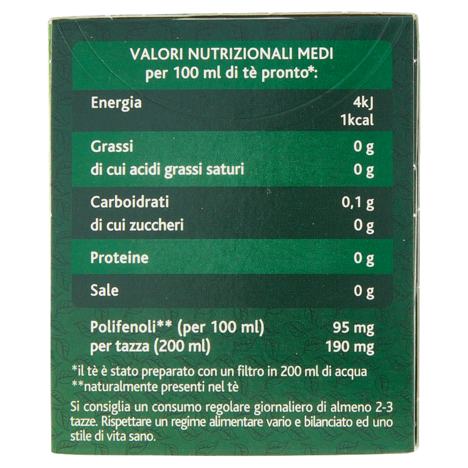 | Valori nutrizionali medi per 100 ml di tè pronto*: | per tazza (200 ml) | |
