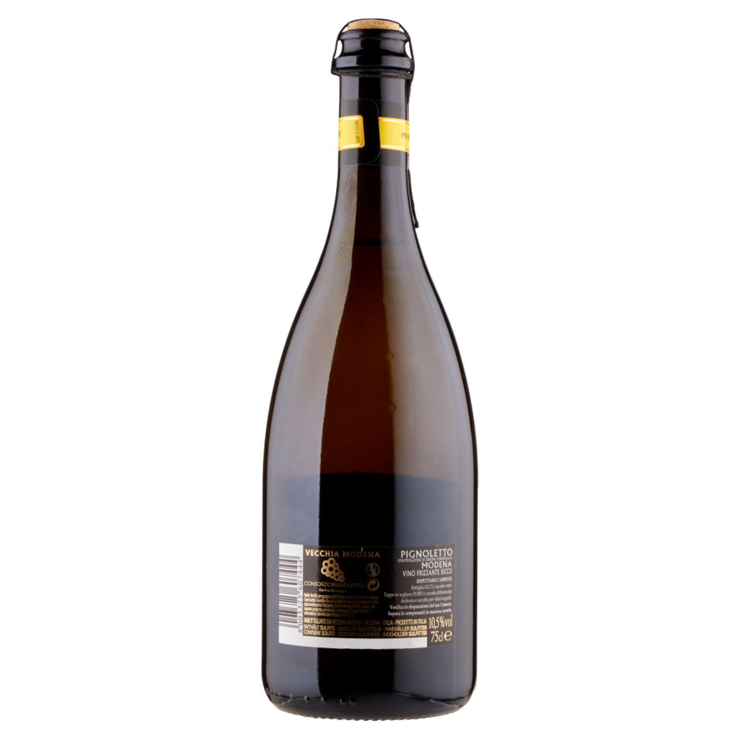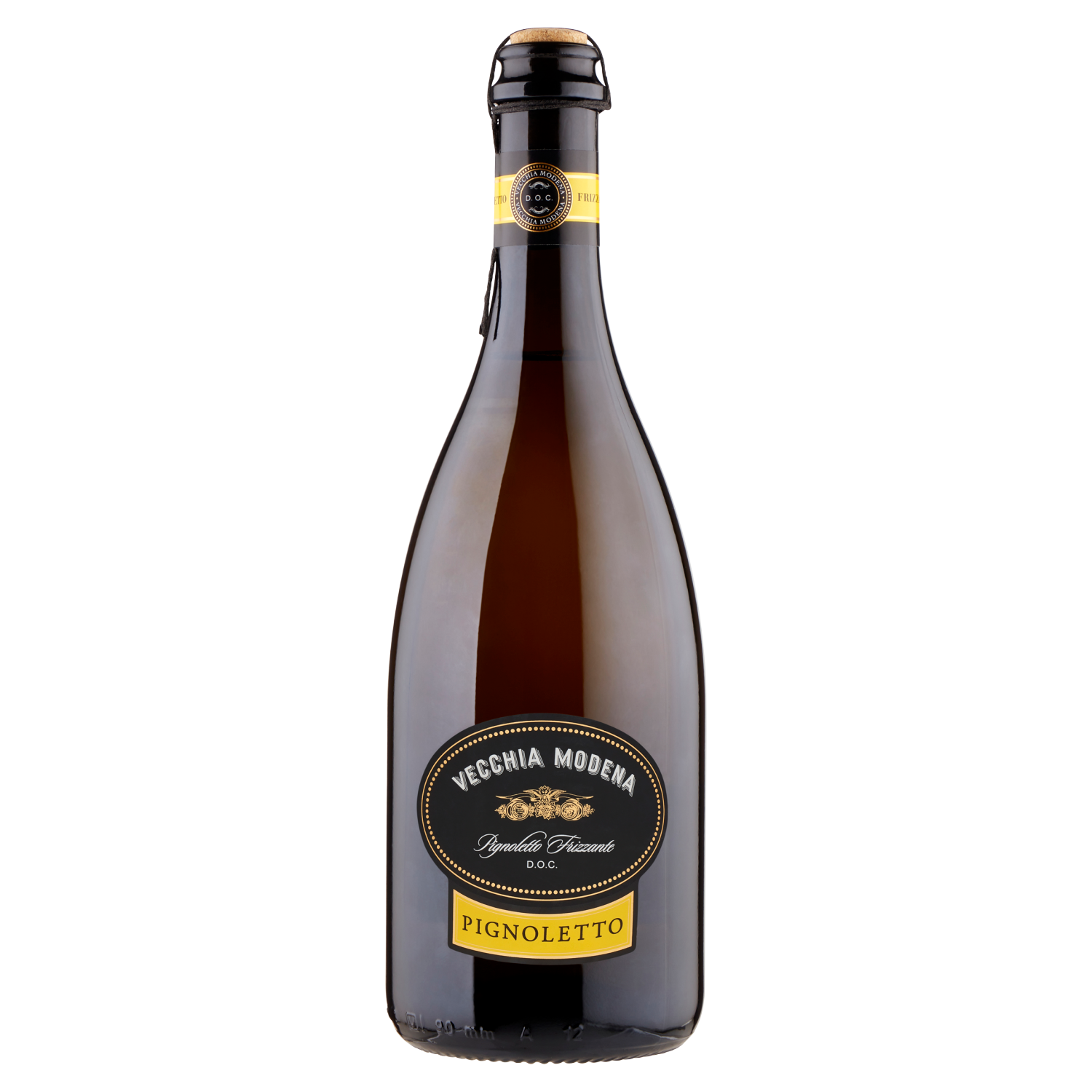 Pignoletto Frizzante D.O.C. Modena, vino bianco frizzante secco italiano. Nelle fertili campagne dell'Emilia si coltiva l'antico vitigno Grechetto Gentile da cui si ottiene questo gradevole vino piacevolmente frizzante, di colore paglierino chiaro, dal sapore asciutto, armonico e bouquet leggermente aromatico. Pignoletto Denominazione di Origine Controllata Modena