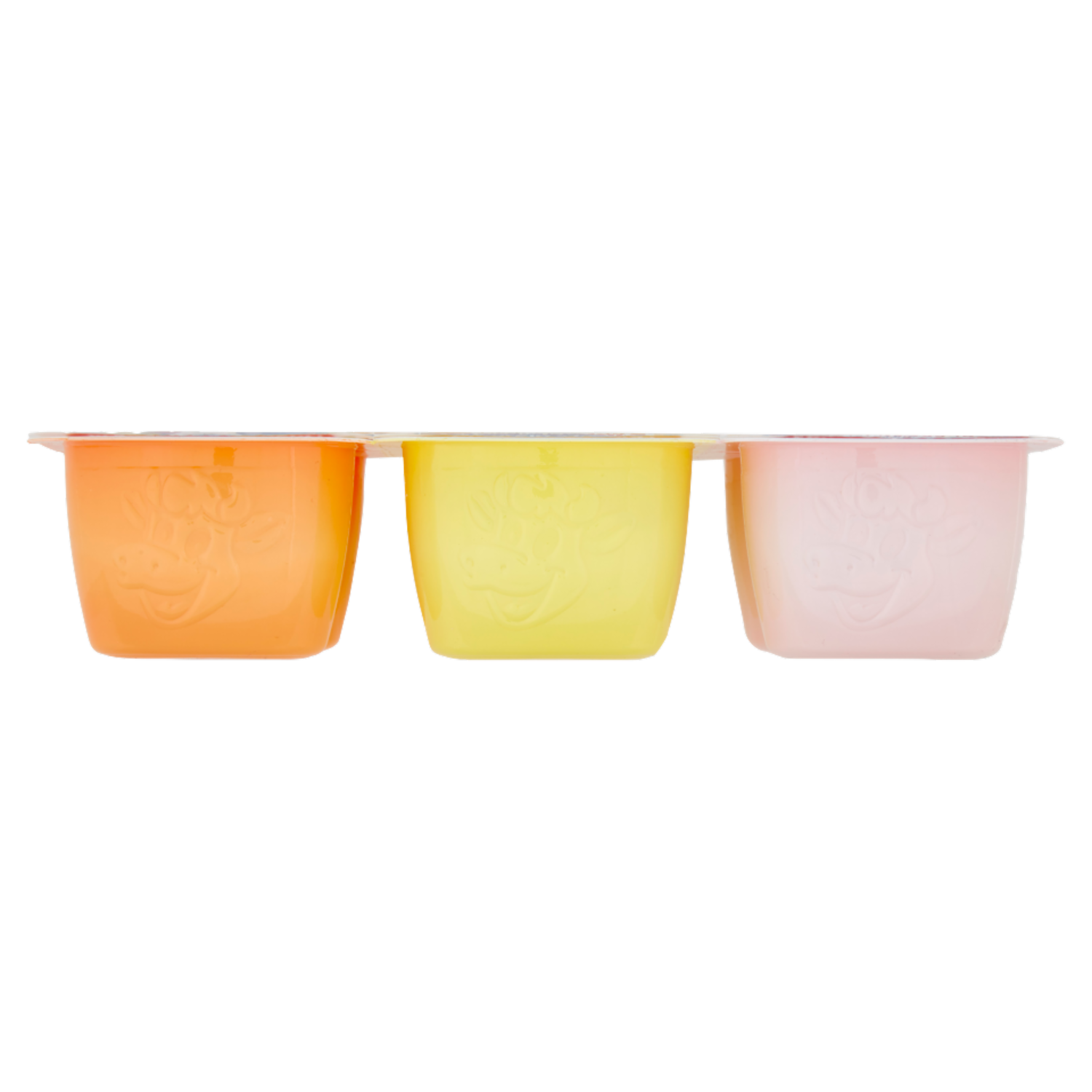 Preparazioni alla frutta [zucchero, purea di frutta da concentrato (albicocca, banana) 5% sul totale del prodotto, polpa di fragola da concentrato 5% sul totale del prodotto, farina di mais 2% sul totale del prodotto, farina di riso 2% sul totale del prodotto, concentrato di minerali del latte, amido modificato, aromi, concentrato di carote, succo concentrato di barbabietola, addensante gomma di guar, vitamina D]