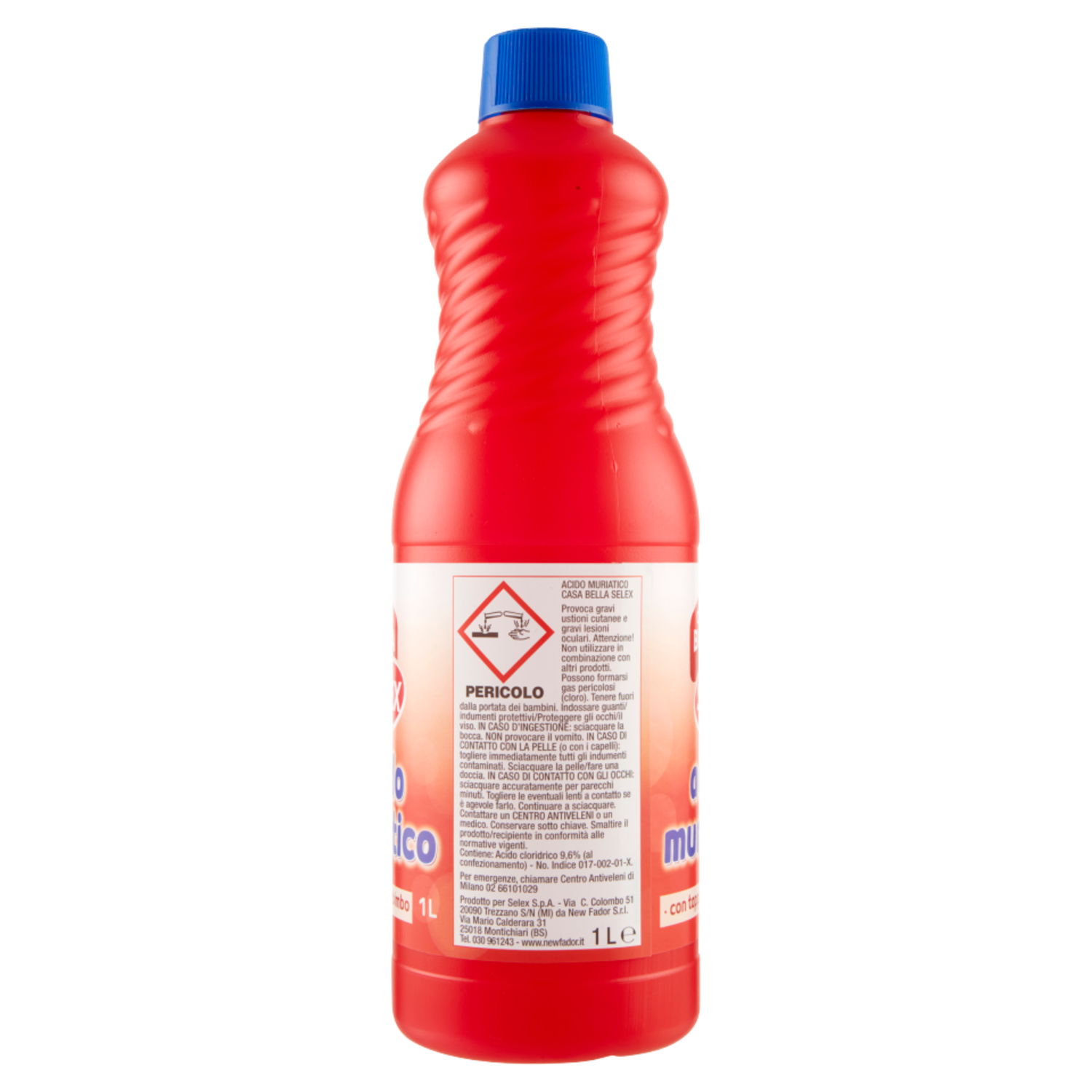PERICOLO Acido muriatico Casa Bella Selex Provoca gravi ustioni cutanee e gravi lesioni oculari. Attenzione! Non utilizzare in combinazione con altri prodotti. Possono formarsi gas pericolosi (cloro). Tenere fuori dalla portata dei bambini. Indossare guanti/indumenti protettivi/Proteggere gli occhi/il viso. IN CASO D'INGESTIONE: sciacquare la bocca. NON provocare il vomito. IN CASO DI CONTATTO CON LA PELLE (o con i capelli): togliere immediatamente tutti gli indumenti contaminati. Sciacquare la pelle/fare una doccia. IN CASO DI CONTATTO CON GLI OCCHI: sciacquare accuratamente per parecchi minuti. Togliere le eventuali lenti a contatto se è agevole farlo. Continuare a sciacquare. Contattare un CENTRO ANTIVELENI o un medico. Conservare sotto chiave. Smaltire il prodotto/recipiente in conformità alle normative vigenti. Contiene: Acido cloridrico 9,6% (al confezionamento) - No. Indice 017-002-01-X. Per emergenze, chiamare Centro Antiveleni di Milano 02 66101029