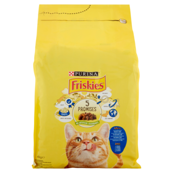 No coloranti, aromatizzanti o conservanti artificiali FRISKIES Adult fornisce al tuo gatto l'alimentazione di cui ha bisogno insieme al gusto che ama, per mantenerlo sano e felice. - Per una digestione sana - Supporta denti ed ossa sani - Supporta una pelle sana e un pelo lucido - Supporta un tratto urinario sano - 5 Promises - Traceability - Quality - Expertise - 100% Complete and balanced - 2025 Commitment - No artificial colourants